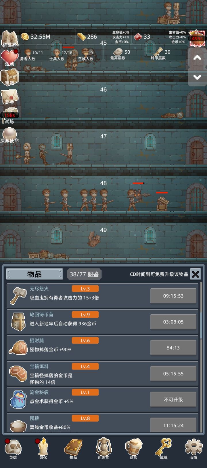 入坑第一天建议,金砖买酒,红石头先不用,留着升级第四个士兵的速度,然后其他三技能,150层之后试炼刷红石头需要速刷