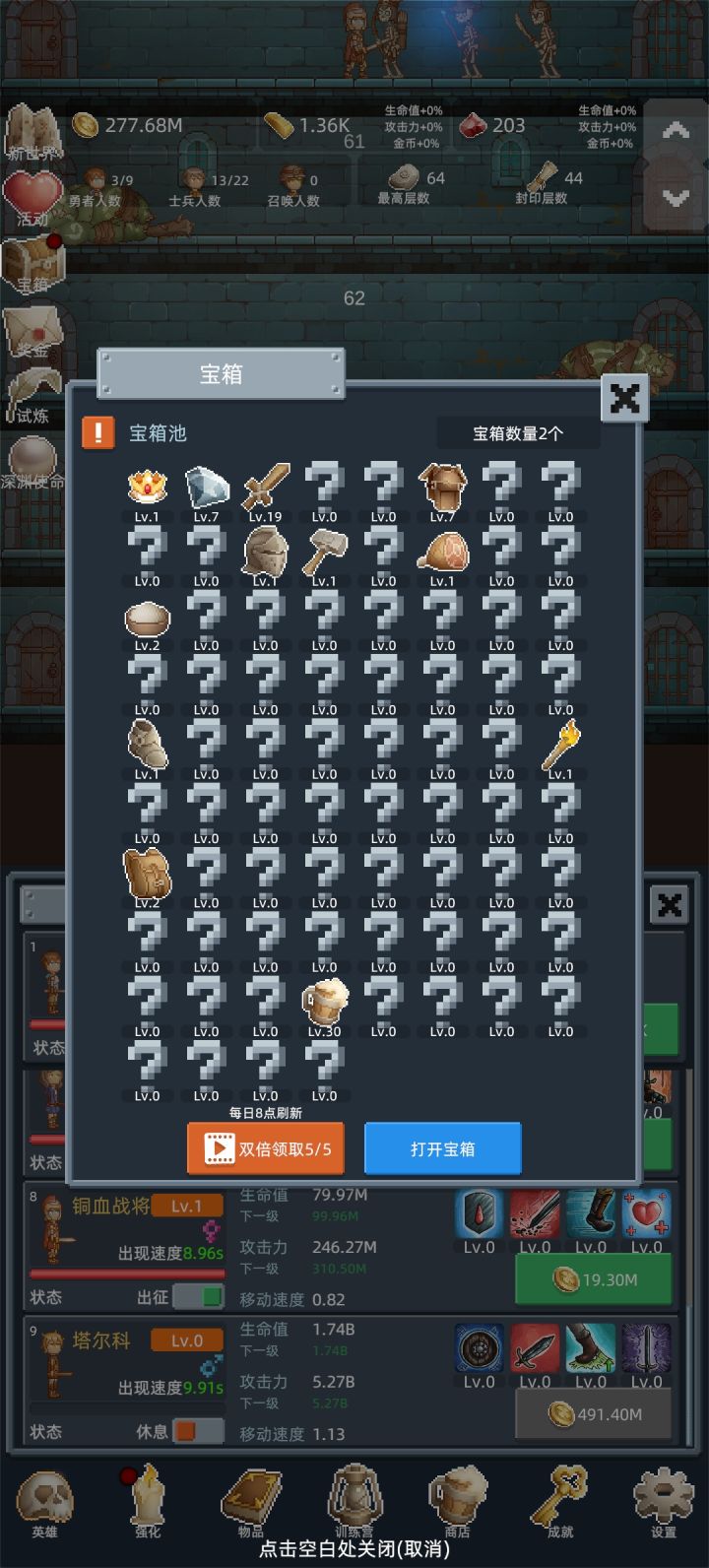 开局进群把兑换码用完, 商店:商店的东西只能买5次,每次开新世界重置 在商店买【勇者之赐】,升级勇者,点击出兵。 在商店买【点金术】,同样只能买5次,建议在第10个士兵【营仗露比】16B,【点金术】给10B-16B的时候买一次。 【点金术】500B的时候,买两次升11士兵【戴维琼斯】。 【点金术】5T的时候,买两次,然后直接开新世界。 士兵每个只用升到4级,就够用了。