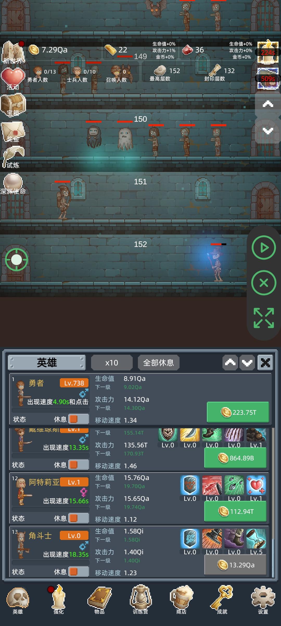 进游戏之后第一件事,把所有能找到的礼包码领了,然后商店购买最下面的勇者之赐,这个东西越多越好,宝石留着升训练营的永久传承,这个需要极多的红宝石。第一次进入打到100层之后凑10T转生,没必要继续打,在转生两三次之后试着打到150,开启试炼。前期大概就是勇者+白玲的打法,开局只升级勇者,用勇者尽量往后推,等勇者的攻击不足把怪物秒杀后开白玲,利用点金术和白玲尽量拿试炼奖励。勇者升级到110之后可
