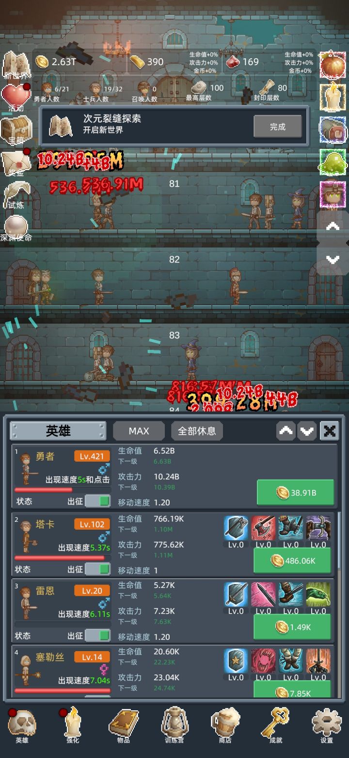 入坑第一天建议,金砖买酒,红石头先不用,留着升级第四个士兵的速度,然后其他三技能,150层之后试炼刷红石头需要速刷