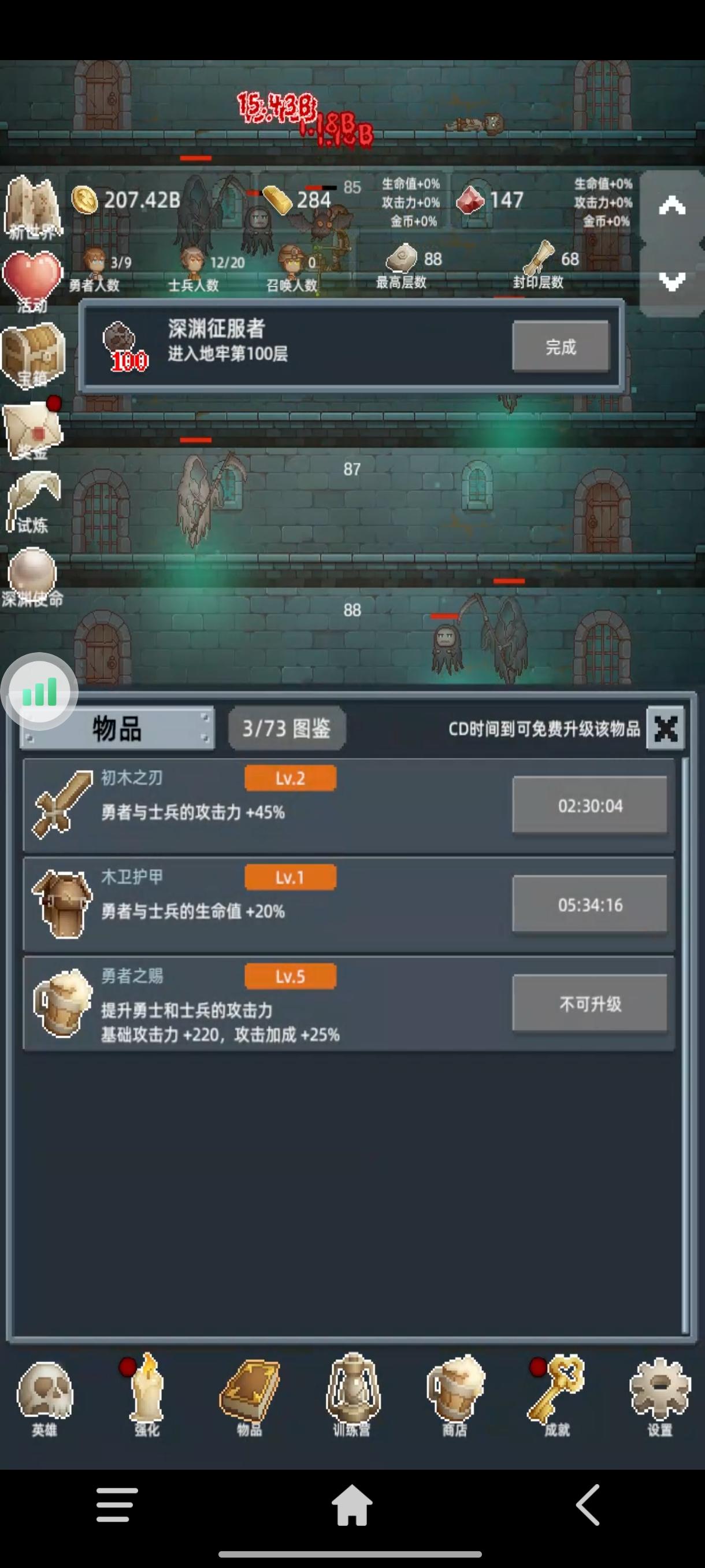 进游戏之后第一件事,把所有能找到的礼包码领了,然后商店购买最下面的勇者之赐,这个东西越多越好,宝石留着升训练营的永久传承,这个需要极多的红宝石。第一次进入打到100层之后凑10T转生,没必要继续打,在转生两三次之后试着打到150,开启试炼。前期大概就是勇者+白玲的打法,开局只升级勇者,用勇者尽量往后推,等勇者的攻击不足把怪物秒杀后开白玲,利用点金术和白玲尽量拿试炼奖励。勇者升级到110之后可