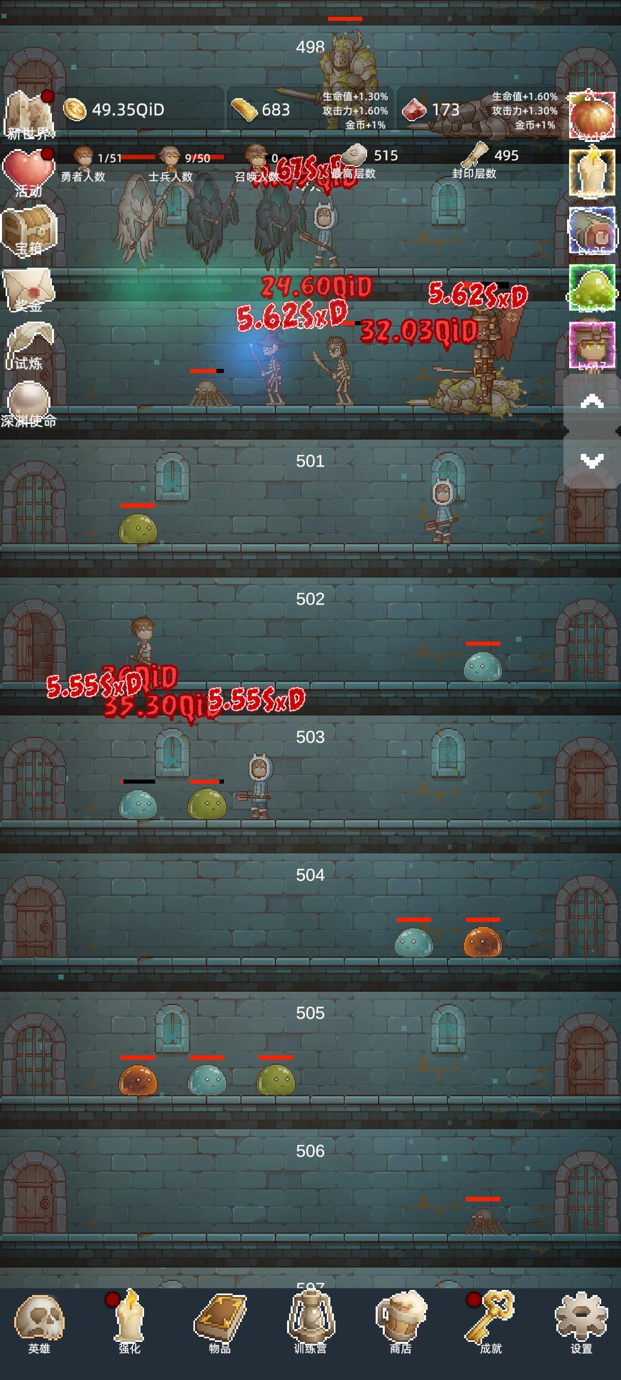 进游戏之后第一件事,把所有能找到的礼包码领了,然后商店购买最下面的勇者之赐,这个东西越多越好,宝石留着升训练营的永久传承,这个需要极多的红宝石。第一次进入打到100层之后凑10T转生,没必要继续打,在转生两三次之后试着打到150,开启试炼。前期大概就是勇者+白玲的打法,开局只升级勇者,用勇者尽量往后推,等勇者的攻击不足把怪物秒杀后开白玲,利用点金术和白玲尽量拿试炼奖励。勇者升级到110之后可