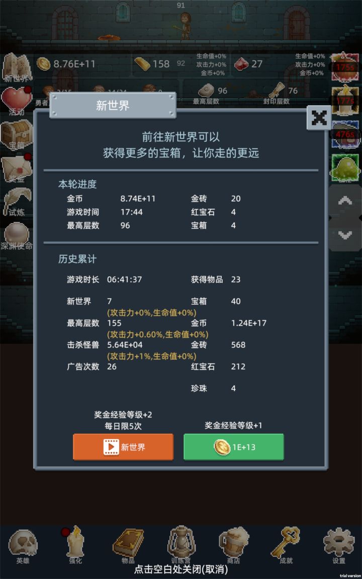 入坑第一天建议,金砖买酒,红石头先不用,留着升级第四个士兵的速度,然后其他三技能,150层之后试炼刷红石头需要速刷