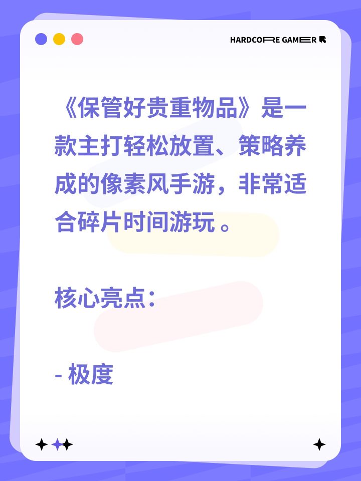 《保管好贵重物品》是一款主打轻松放置、策略养成的像素风手游,非常适合碎片时间游玩 。 核心亮点: - 极度护肝:全程自动战斗,离线12小时也能稳定获取资源,每天只需几分钟安排阵容、领取收益,彻底告别“不肝就落后”的焦虑 。- 零氪友好:没有强制氪金,核心英雄与养成内容均可通过游戏内积累解锁,养成节奏平滑舒适 。- 成长感强:“探索-转生-变强”的循环设计巧妙,每次转生解锁永久属性,战力