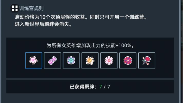 ~接上回,说一说最近更新的训练营,它目前是一个当前世界临时buff玩法,分为男女英雄各攻击力技能丨生命力技能。只能一个开启状态!一次开启后,后续转生存在。推荐选择女英雄攻击力技能,英雄4-女英雄,是前期跑的最快的一个,方便前期速刷图使用。目前女英雄位置 4 7 8 10 12 我已经点满攻击