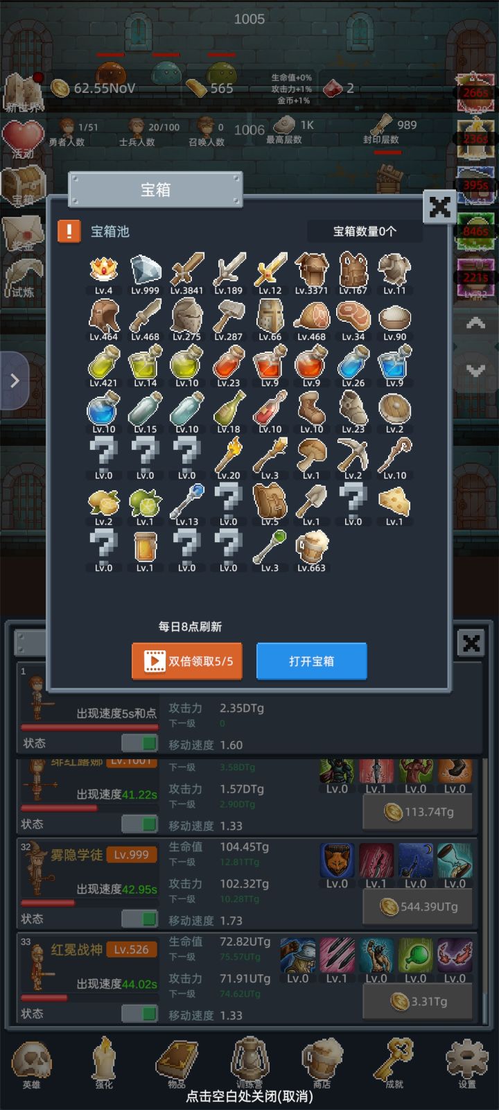游戏核心资源:金砖和金币。1、金砖通过兑换码,联系客服反馈bug获得2、金币通过击杀怪物获得金砖分配,只用在勇者恩赐加群体百分比攻击。金币分配,针对新玩家前3轮转生不建议升级士兵,只用做【开士兵和升级勇者人口和士兵人口】。打不过去就【升级勇者】,勇者等级上去后【升结晶与魔晶】。前3轮转生均在105关左右,开997B士兵后囤金币10T转生用。请各位玩家重点注意,游戏的商店机制,也就是5次