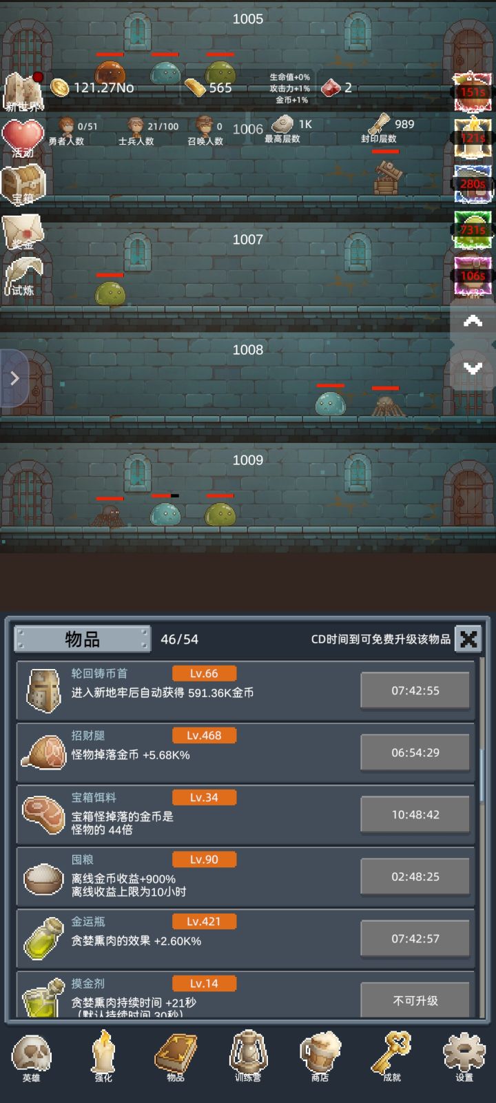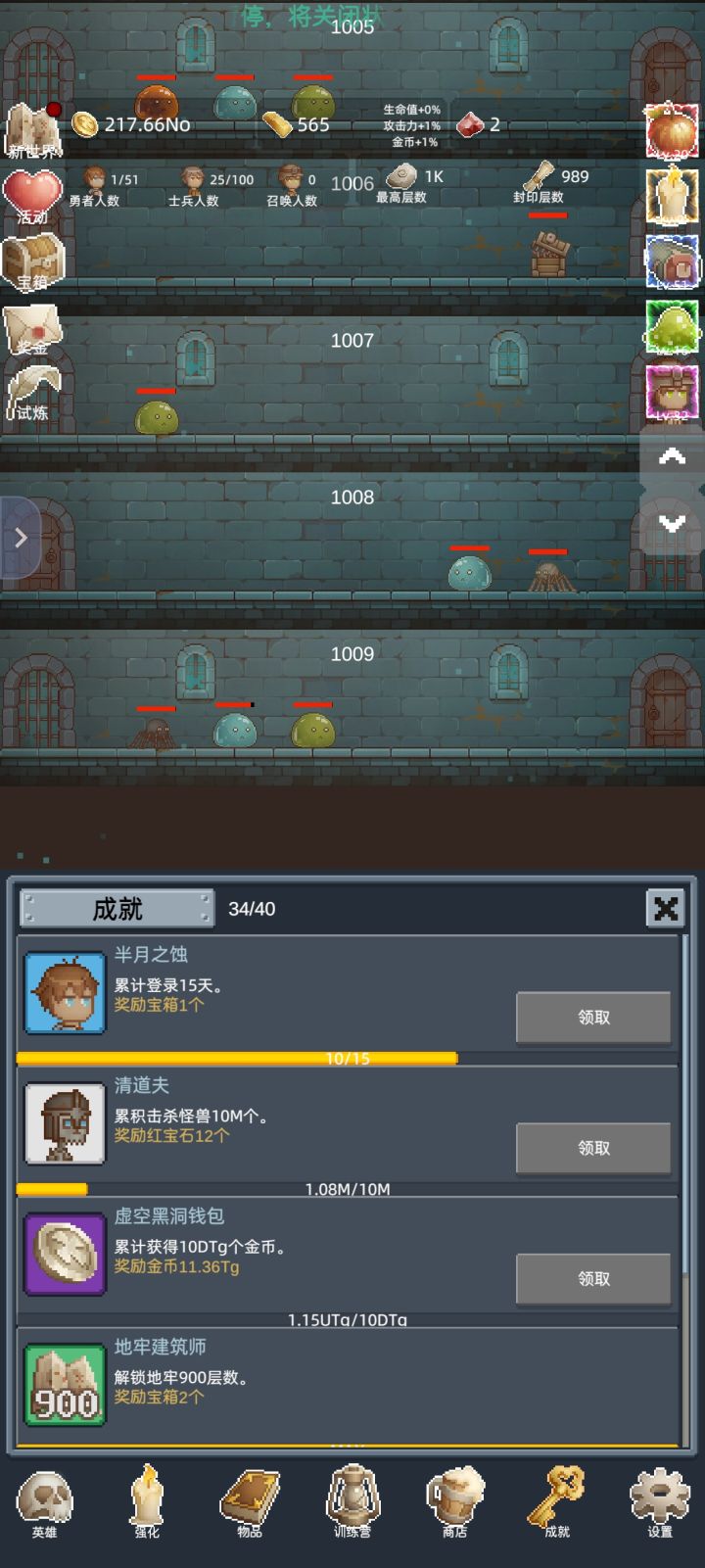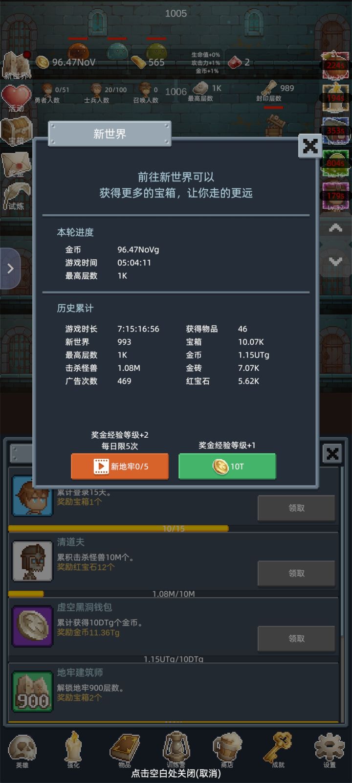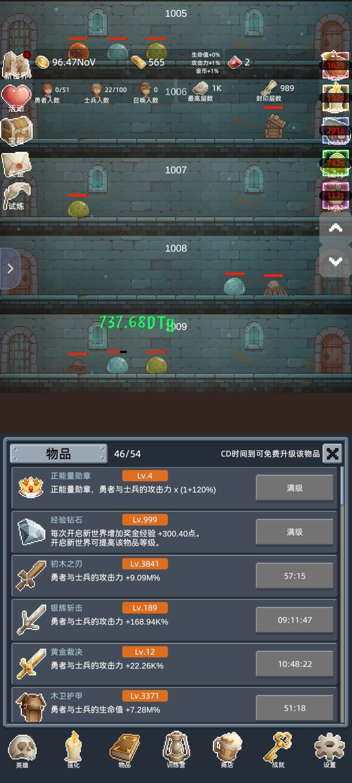 新人进群首看群公告,兑换码搞一搞,tap上分享3次游戏动态-截图私聊群助理,会给你三个正能量兑换码,然后新世界4转再赠送一级,满级。 前期金钻商店买最下面的勇者之赐,每次转生必买!!!玩法首次爬关100关,金币10T开启新世界(也就是转生),10T金币比较困难,大概在105关时候,商店点金术单位T时候看广告,加速