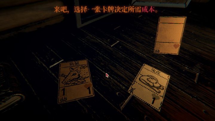 《邪恶冥刻》这款游戏发生在一个密闭的小木屋内,玩家扮演的主角必须和一位名叫莱西的神秘人打牌。在牌局间隙时,玩家可以自由探索莱西的小屋。游戏的画面以第一人称的视角进行呈现,玩家在莱西的小屋里多转转,就能发现这个小屋并不简单——屋内暗藏的机关和谜题需要我们去破解,原来这并不是一款只能打牌的卡牌游戏。当然,在游戏初期我们还是以卡牌对战玩法为主,与莱西进行对战,不断合理化我们的卡组构筑,尝试在爬塔式的冒险中走得尽量远一点。
