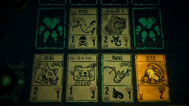 实际上,打牌虽然是本作的核心玩法,但实际上只是这款游戏的一部分,后面的剧情和玩法结合地十分紧密。游戏中有很多“打破第四面墙”的Meta要素,从玩家初始卡组里那张会和玩家说话甚至吐槽玩家打牌技术的随从牌白鼬和臭虫,到之后需要玩家脑洞大开堪称彩蛋的各类谜题,制作组甚至为玩家准备了跳出游戏的ARG内容(可以理解为将游戏中的一些要素延伸到了现实世界),这种奇妙的互动感实在是魔性十足,只有亲身体验之后才能完全感受到。值得一提的是,玩家每一次的失败都会导致神秘人莱西用照相机将玩家“做成”一张“死亡牌”——不过不是真的把人变成卡,而是玩家从失败时所持有的卡组里找出三张牌,将其费用、身材(攻击力和血量)、印记(特殊效果的词条)保留下来并合而为一成一张卡牌,这就是玩家的“死亡牌”,可以在之后的冒险里选到。这种“死亡牌”往往是非常超模的,所以玩家不必担心自己前期失败太多,每一次的失败都会增加一张超模的“死亡牌”,会给我们以后的冒险提供极大帮助。