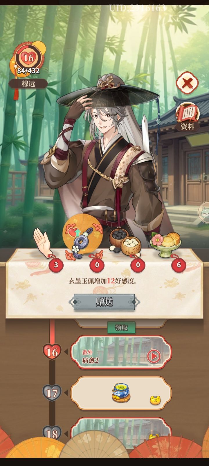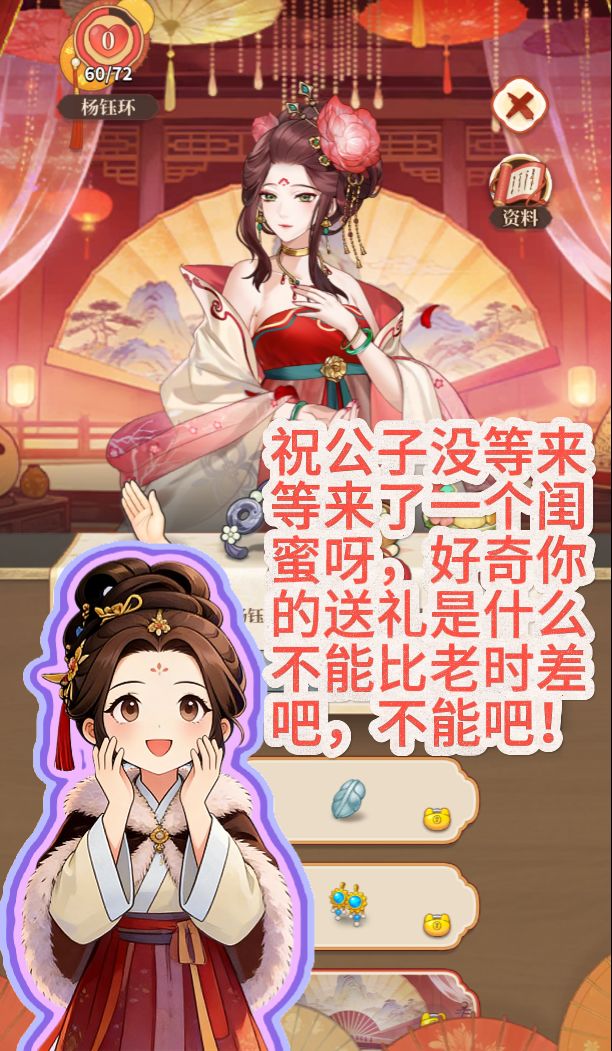 1.今天就更新了一位新的好感度朋友:杨钰环(好奇送礼不能比老时少吧,不能吧,不能吧)。可惜不是祝公子,有点小失望。其他的没有了,要过年了,官方肯定偷懒过年去了