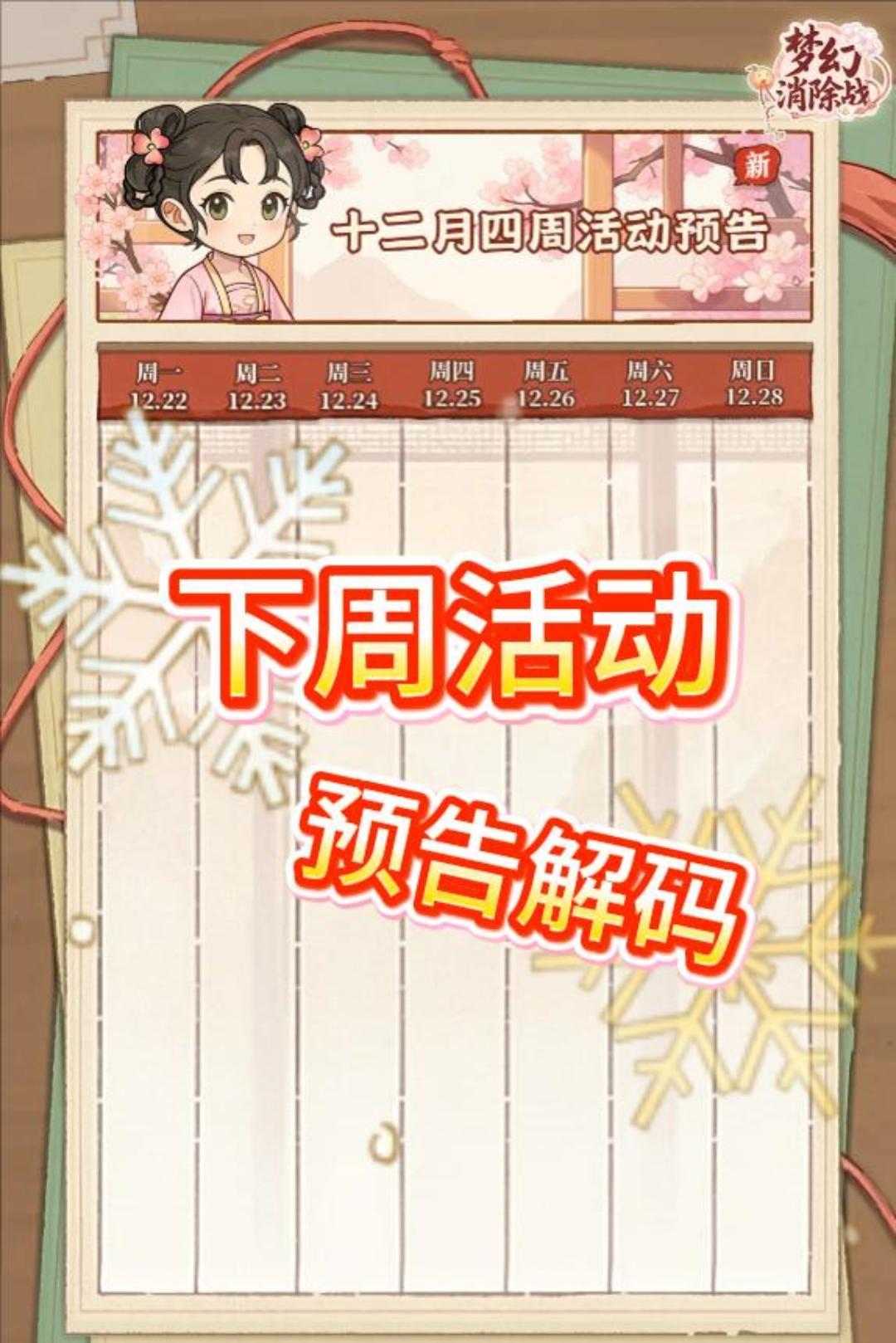 十二月第四周的活动解码又来啦!本帖仅归纳+预测 大家玩得开心!#发现好游戏 #梦幻消除战 #玩梦幻消除战送苏绣 #苏绣 #梦幻消除战攻略