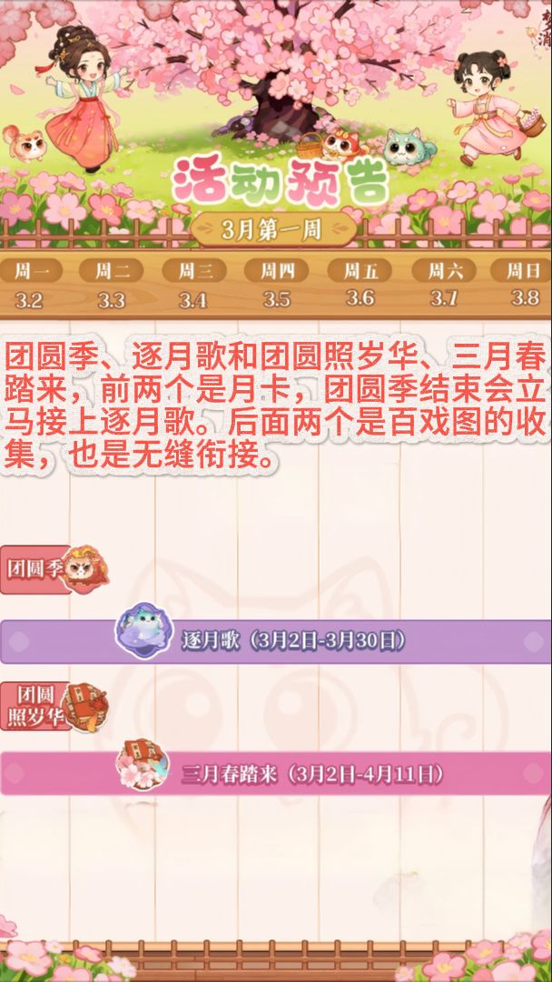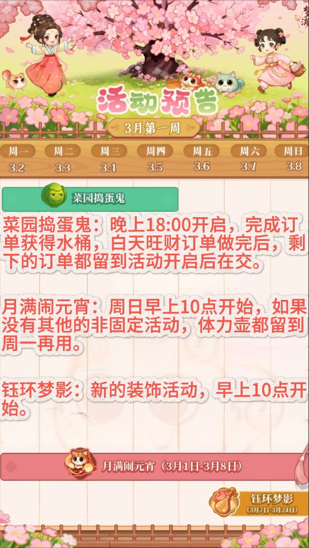完成订单获得奖励活动:1.旺财来了,每周一早上10点开始,限时一个半小时。通过完成高级订单获得5星戏符奖励!(需1-3个高级棋子)2.菜园捣蛋鬼,周一3.2晚上6点开始,为期3天。水桶记得合成!(看P2)消耗金币获得奖励活动:3.秘府寻幽,周四3.5晚上6点开始,为期一天。4.茶楼大赛,周五3.6晚上6点开始,为期3天。竞赛类(共计12轮)5.团圆季-逐月歌,月卡,30和45两个档位,