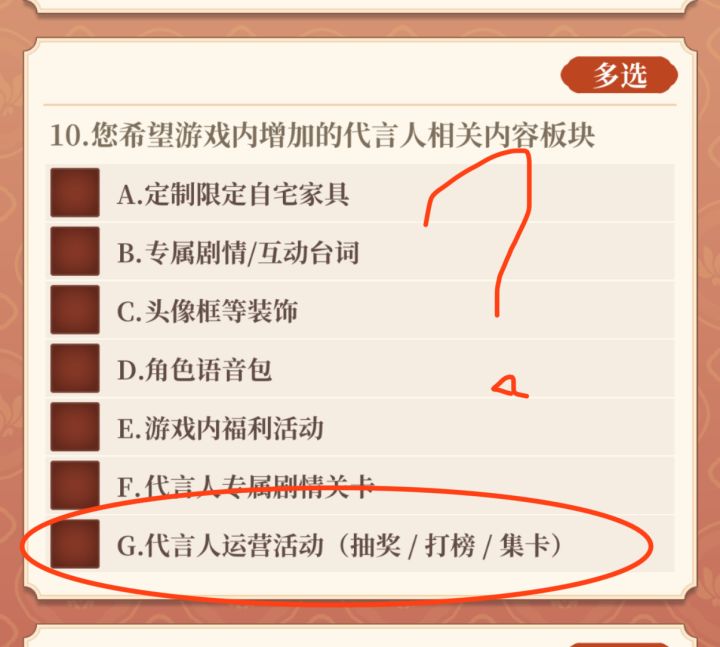 没见过哪个游戏玩的好好的把周常活动改掉的,爱作死到这种程度真的没啥好说的,玩游戏是为了休闲开心不是为了添堵OK?福利少能理解你们要挣钱,但是玩家氪的金变成了明星的代言费,然后日常只给玩家发几十体力的福利,你们真是嫌劝退的不够多啊假模假样做个问卷调查,从一开始都不给人不要代言人的选项,要是有人想公费追星大可不必绕这么大一圈哈作为一个追星人而言,娱乐圈现在糊成这样你还指望粉丝真的为了代言人去玩游