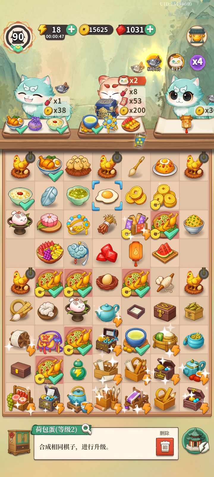 首先介绍一下触发冰冻棋子的几个要点:1.两次冰冻棋子间隔需8小时。2.体力低于50点。3.购买10红钻的每日体力。4.订单需求出现10级或者11级棋子,包包为9级或者10级。5.自身棋盘上不能出现低于订单需求1级的棋子,例如需求10级糕点,则棋盘上不能出现9级糕点,否则不会触发冰冻棋子。一般推荐用低级棋子合成触发冰冻棋子,可以节省更多体力,例如用4体力的3级棋子+3级棋子合成即可。1级