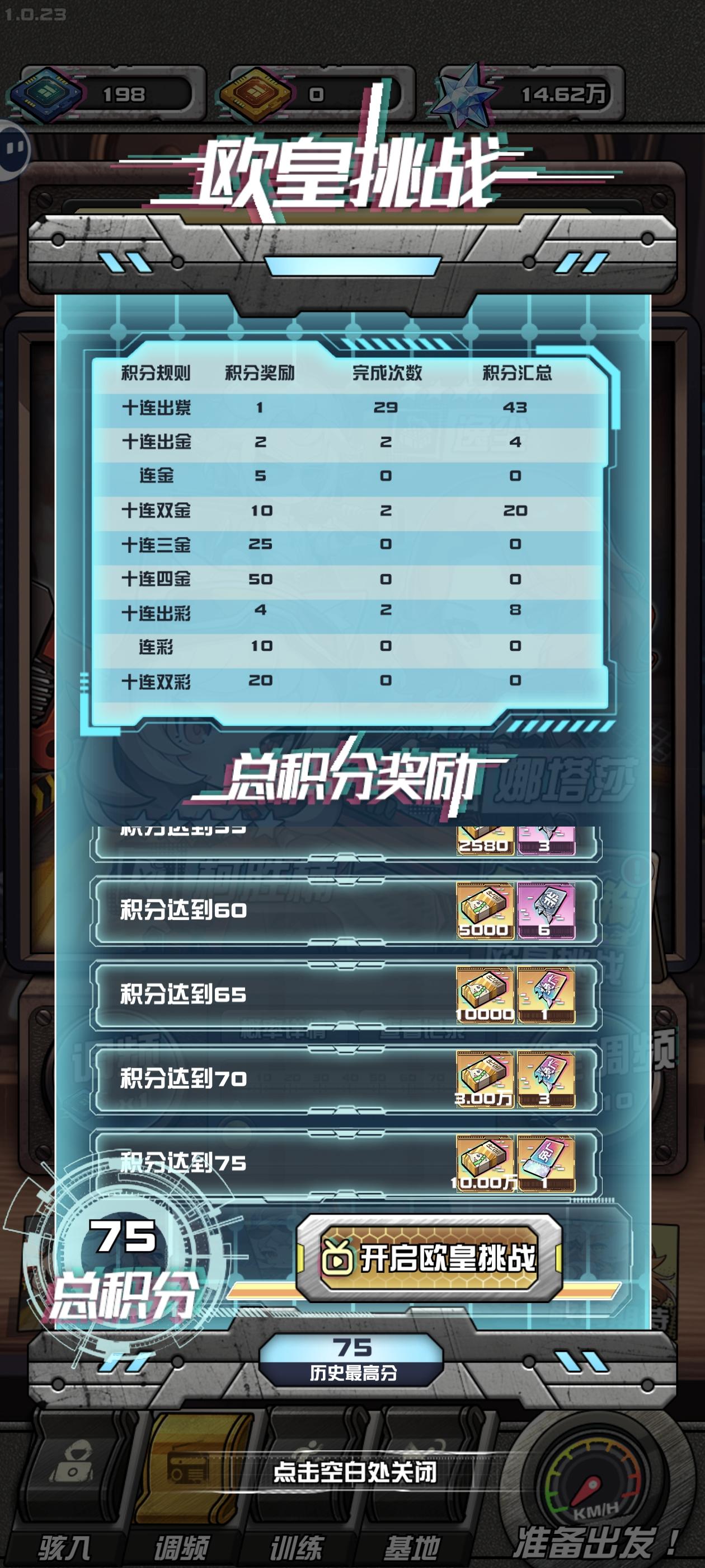 新手进游戏第一步先随便抽抽卡获取一下角色。角色分UR(彩色) SP (金色)SSR(紫色)。后续看看广告都会全角色满命的不用急。楼主比较非酋,2w7抽才入魂了免广卡。实际上角色已经早就全收集满命了。不着急的小伙伴可以等商店里的星核对换是每天都刷新的相当于双倍充值了,超值礼包每一档的最后一个包含的彩色碎片可以在背包里合成彩色角色(也就是抽卡里最稀有的UR)。在抽卡前开启欧皇挑战可以根据300抽获得