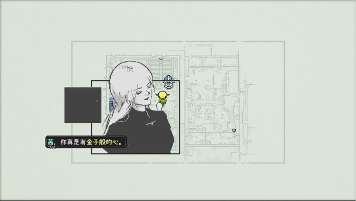 回到游戏本身,其实主线非常的简单,我们的主角茜作为lather一个对抗AI的组织中的一员,与小BOT一起奉长官的命令对抗AI机器人,寻找关键的“锇元素”。在第一次行动中便使出吃奶的劲抬回了120公斤的锇元素,而事后我们才知道其实外壳是不需要的。