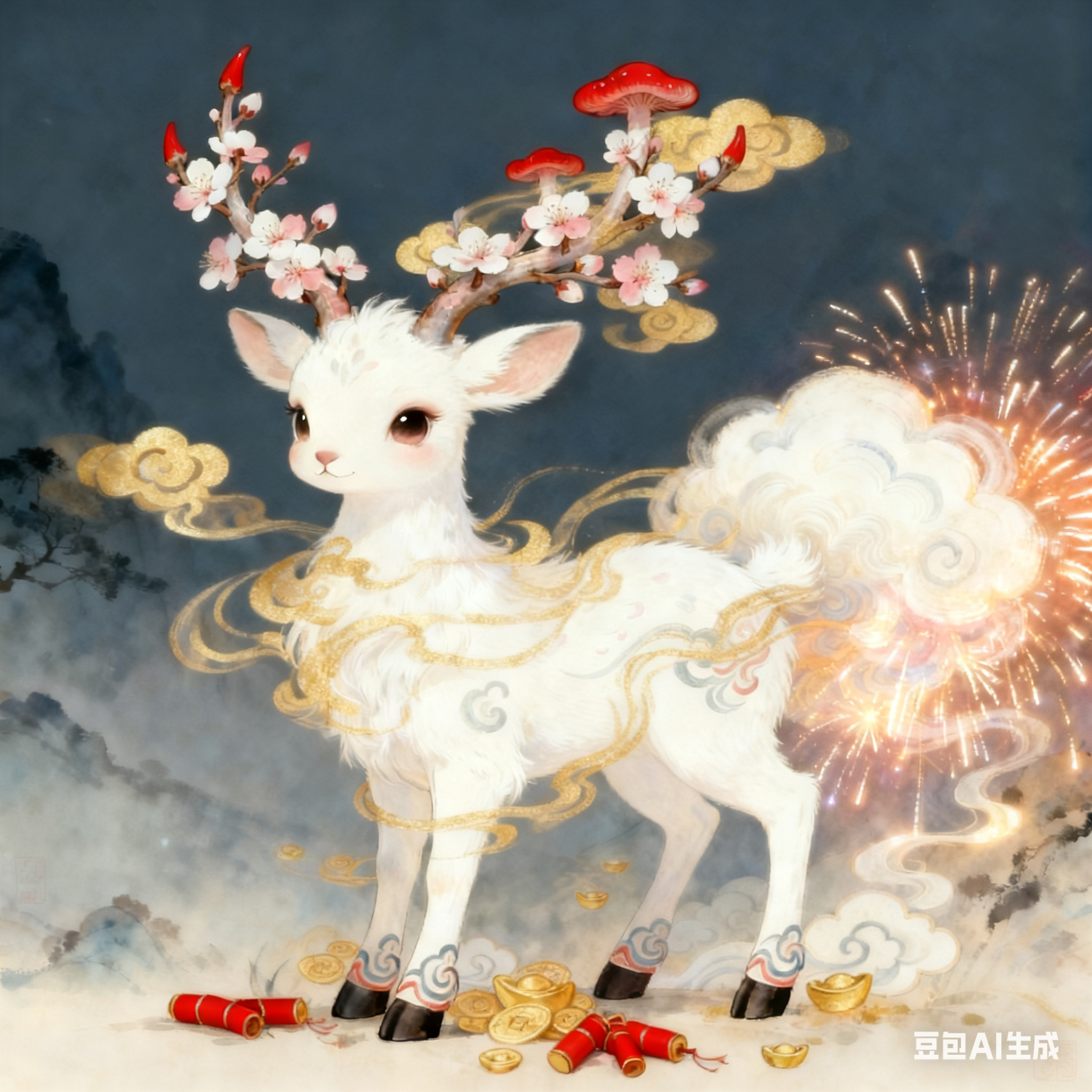 名称:华岁云鹿背景故事昆仑墟深处有一株千年古梅,自上古便守着瑶池边的云渊,岁岁只在新春绽蕊,却从未结出梅实。甲辰马年新春,天庭降下的祥瑞星力撞入梅树老干,竟让树芯凝出一枚裹着鎏金云气的鹿形灵核。三日后灵核破树而出,化作这头雪毛云鹿——鹿角承着古梅的花枝与灵芝,身缠云渊的鎏金云纹,尾曳瑶池的烟岚,连四蹄踏过的地方,都会凝出新春祥云与梅蕊的虚影。起初云鹿只在昆仑云海间游走,后遇一位途经的修士以新