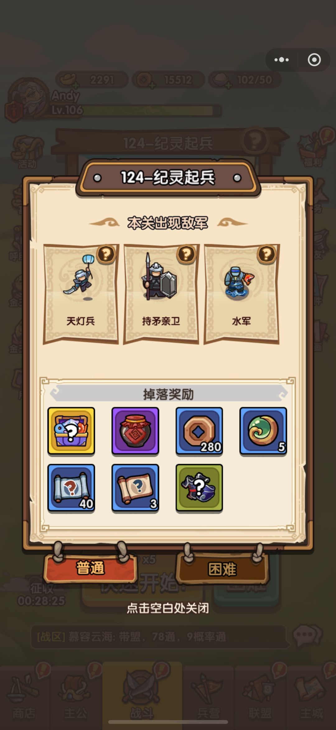 第15关关卡攻略 1.关卡构成 2.推荐过关配置 玩家攻击力推荐:400 兵营等级推荐:弓兵6级,火法4级以上 宝石携带推荐:弓兵连射+1 3.过关策略概述 优先铺满兵种后,选择火法的牌清理小怪,小怪都是火弱点 大概火法5级后,开始选择弓兵的牌准备清理张角 随后弓兵的相关牌拉满,没有合适的牌时可以适当补足刀盾兵当前排 本关推荐有弓箭连射+1后挑战,难度会大幅度降低,(第一天也可以蓝色宝石开出来) 小