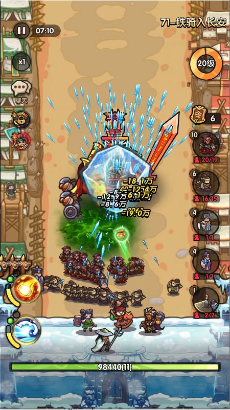 平民玩家资源不多,好不容易出个军师武将还不是自己想要的,奋战一个月才合出2个红玉,词条效果也不能过多强求。在这种条件下,民转冰法似乎是策划大大特意给平民玩家最后的体面,不得不说这套路还真挺好用,民兵技能树点到转职冰法就可以(没有任何卡点),局内成型快(冰法师+民兵强化60%),运气好前五波结束就出来了,剩下的就是全部点冰民技能牌(核心牌冰冻穿透+人海),基本上能通过大部分关卡。71关我在冰民为核心