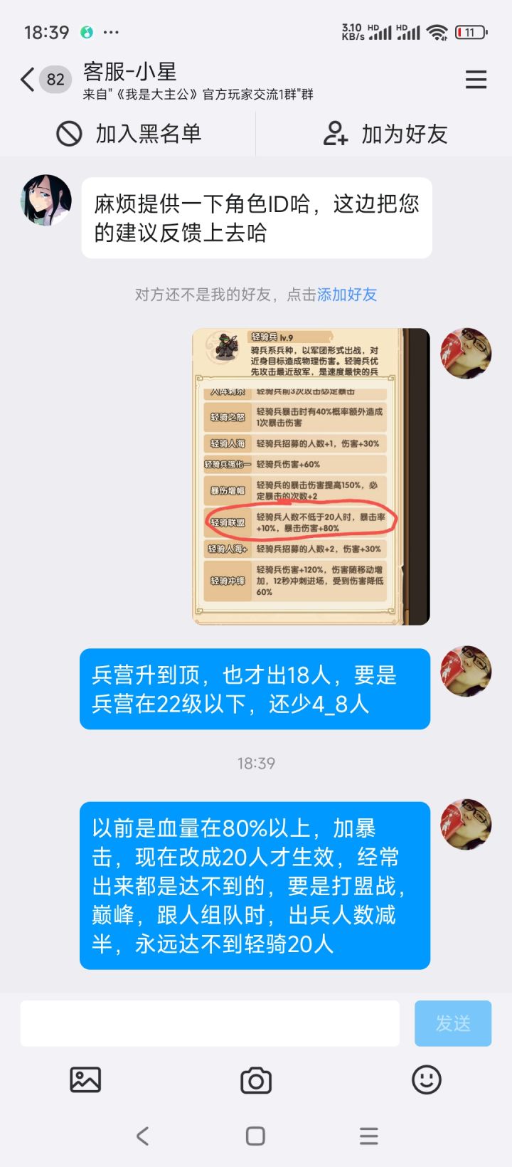 看轻骑联盟说明,要场内轻骑人数在20人以上才生效,这个词条就对全场人来说都很难达到。所以这词条就是无效,不要说打盟战和巅峰时时组队的,轻骑人数再减半,永远达不到20人。请改回以前血量80%以上加暴击有些人会说,上个人口上限+2玉或弄召募人数+的玉和词条玉的位置不够,大把好玉石要上,不可能因为这场内随机出的轻骑联盟词条上个人口上限+2的玉。召募人口可弄,但你人口上限18,把小怪消光时只有bos
