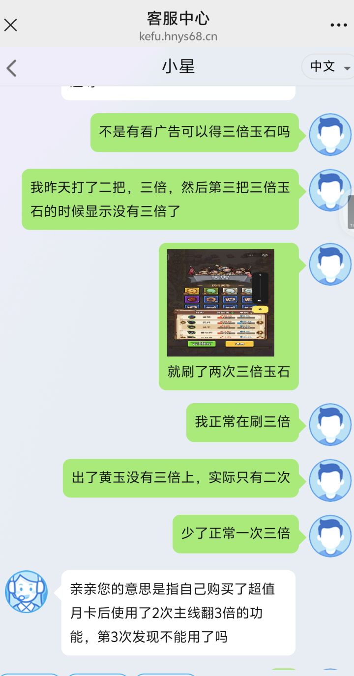 正常刷三倍注意看,左上角1.5倍刷通关过的图,然后五级退出,出了黄玉用三倍显示用不上了,因为我只开了三倍奖励的会员,很清楚自己就看了两次广告,玩了这么久,这出了黄玉没三倍心里很不痛快,就找客服了,结果一天磨下来说我三倍使用了三次,他后台技术查我三倍有没有用三次,看我玉石获取记录,有没有三次三个一样的不就对了,就说我使用过三次三倍了,我真用了三倍,我这不是来跟你无理取闹的,无语了
