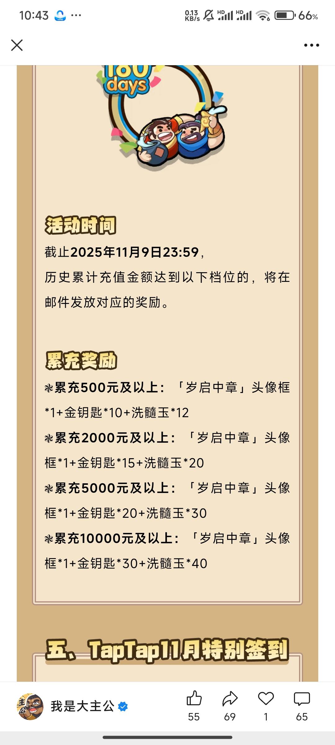 主公大人们久等啦~香香带着11月签到福利赶来了!本期福利升级——全新官方周边送上ヾ(≧▽≦*)o即刻起至11月30日,每日登录TapTap社区签到► 签满15天必得金钥匙*10,洗髓玉*30,元宝*564,粮草*200► 集卡成功即可兑换首批官方周边——“抱”得美人归抱枕*1(香香特意准备了100个,就等主公把它带回家啦~)【签到福利日历】📅 第1天:粮草*50📅 第2天:金