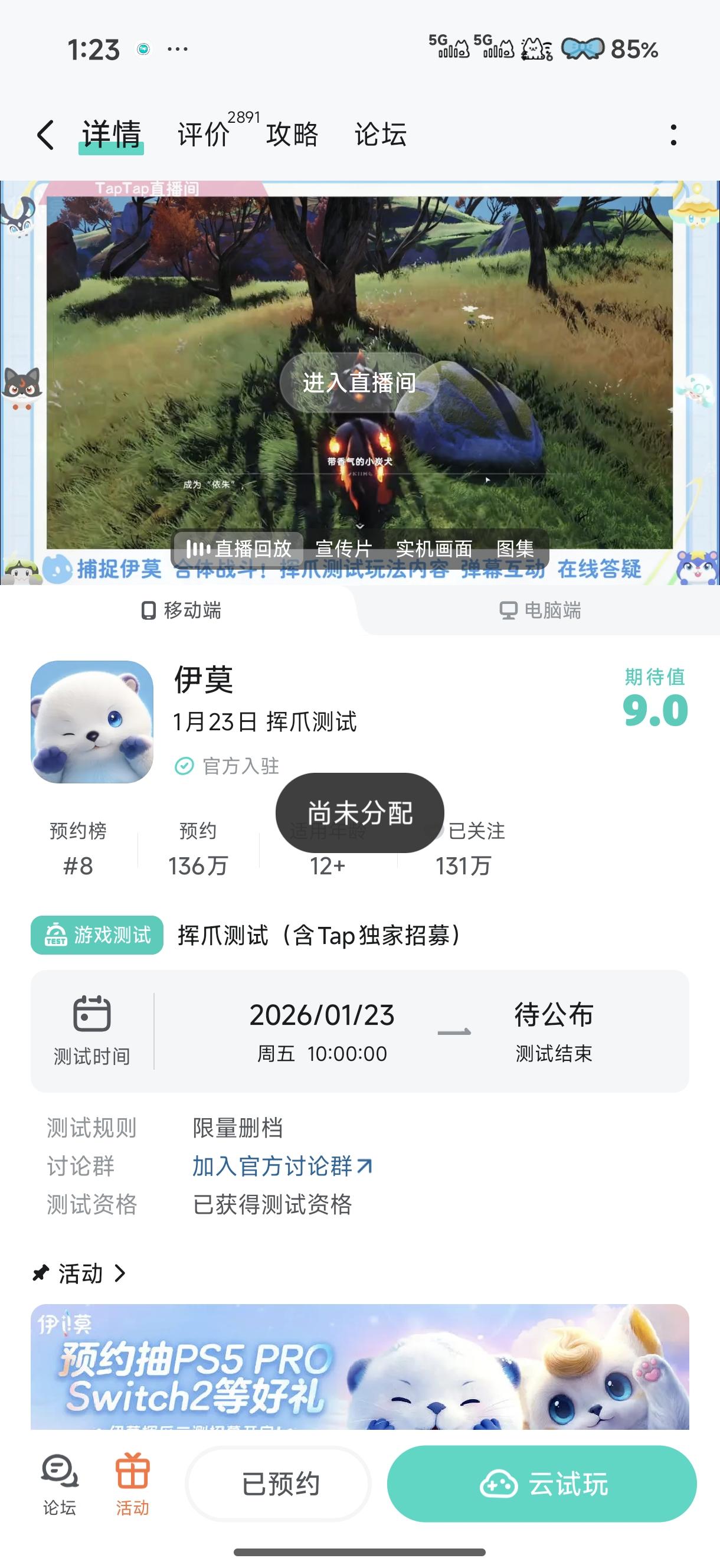 #伊莫 从一测到二测每场直播都看每天抽奖都抽,问卷调查预约一个没少就是没给资格,求个好心人玩不过来或者不想玩的可怜一下,平常就爱玩这些抓宠类游戏