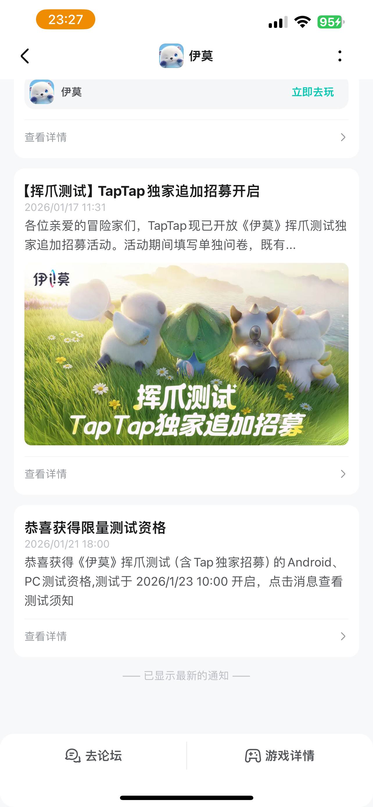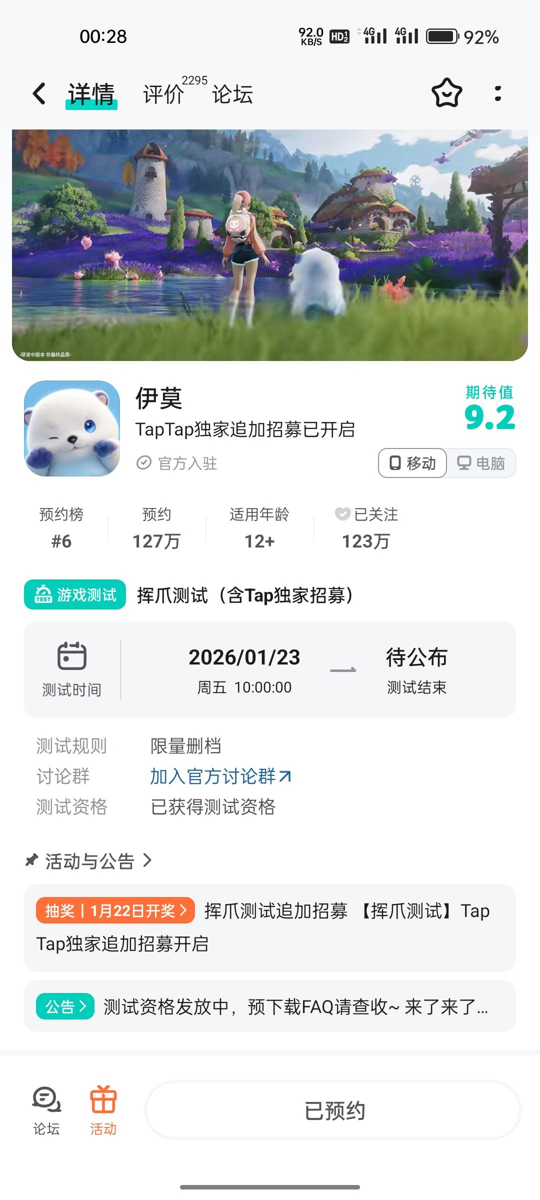 《伊莫》挥爪测试招募即将截止,孩子们已经翘首以盼冒险家的到来啦——⏰ 招募截止时间:2026年1月16日 23:59🎮 测试时间:2026年1月23日正式开启⚠️ 重要提醒:招募截止后,测试资格将陆续发放,我们将以短信&邮件形式进行通知,并同步开启预下载;2026年1月21日起,可登录《伊莫》官网查询资格获得情况。官网预约《伊莫》,公测上线即可获得专属奖励“羞羞獭神秘蛋”~冒险家,我