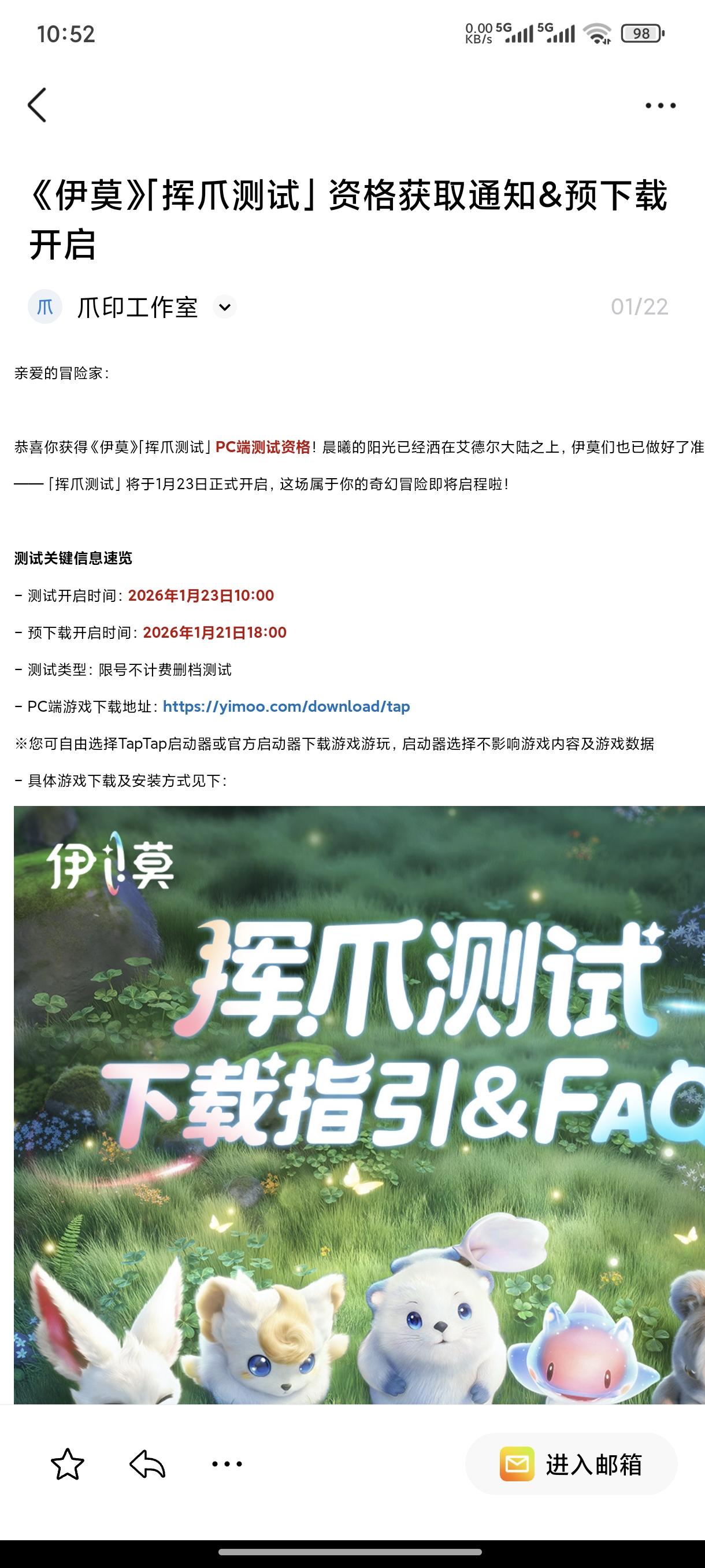 来了来了,真的来了!挥爪测试要开门啦!如何确认是否获得测试资格?怎样下载包体?伊莫爪把手来教៷>ᴗ<៷详细指引请看图片内容,1月23日我们一二三挥爪开测!伊莫最大的心愿就是和你一起冒险!挥爪测试即将开启,预约《伊莫》,公测上线即可获得专属奖励“羞羞獭神秘蛋”~冒险家,我们艾德尔大陆见!#伊莫 #伊莫挥爪测试 #aniimo #有伊莫不emo