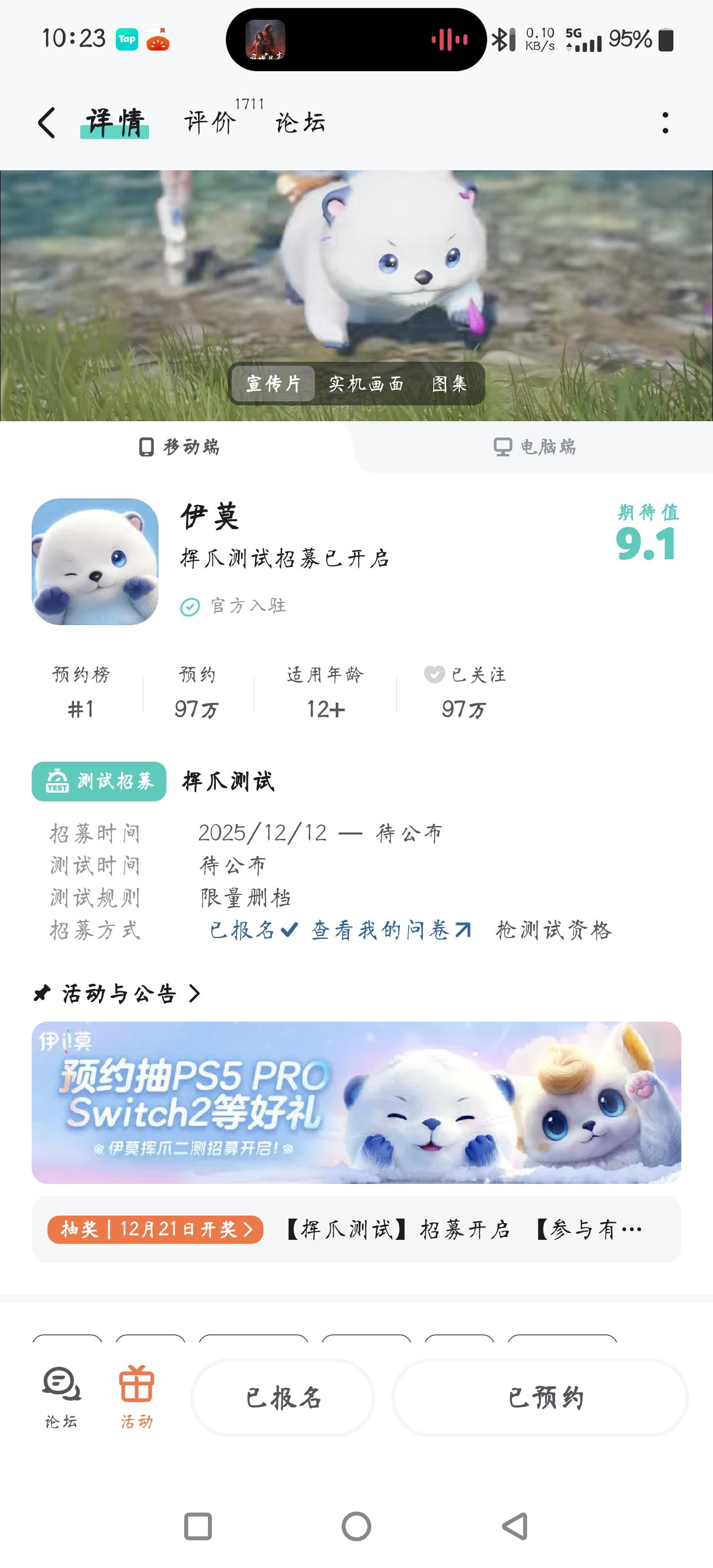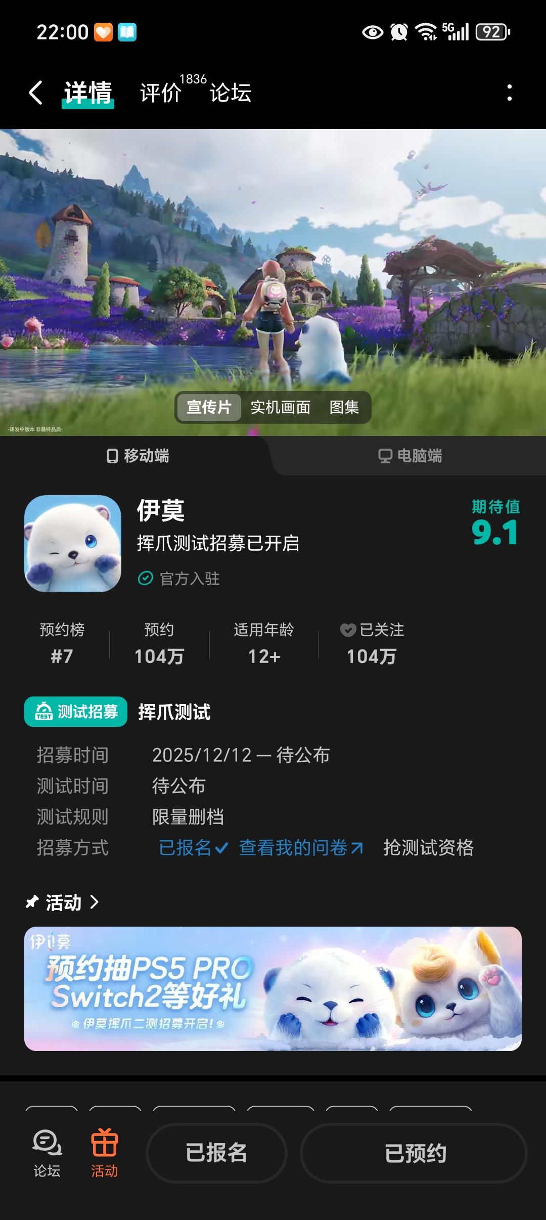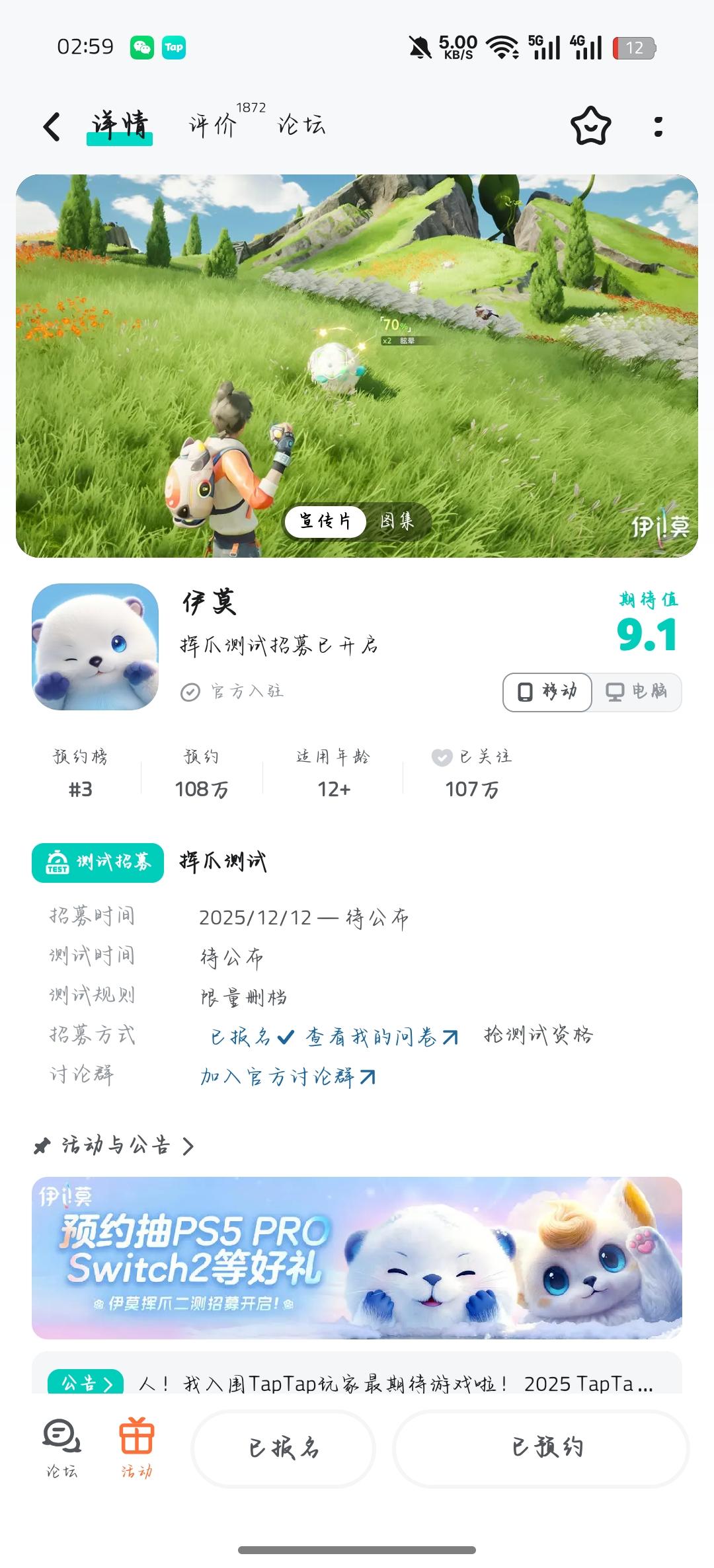 我也期待这个游戏很久了,一直期待着,这一次,内测资格终于又来了,之前玩其他冒险类探索类手游,抓宠物之类的,认为这种就非常好玩,非常能够治愈人,而《伊莫》这款游戏,成功利用宠物的外表和高超的探索度让我垂帘忘返,一直期待着,希望这次内测资格能抽到,我也希望这款游戏能够越来越好