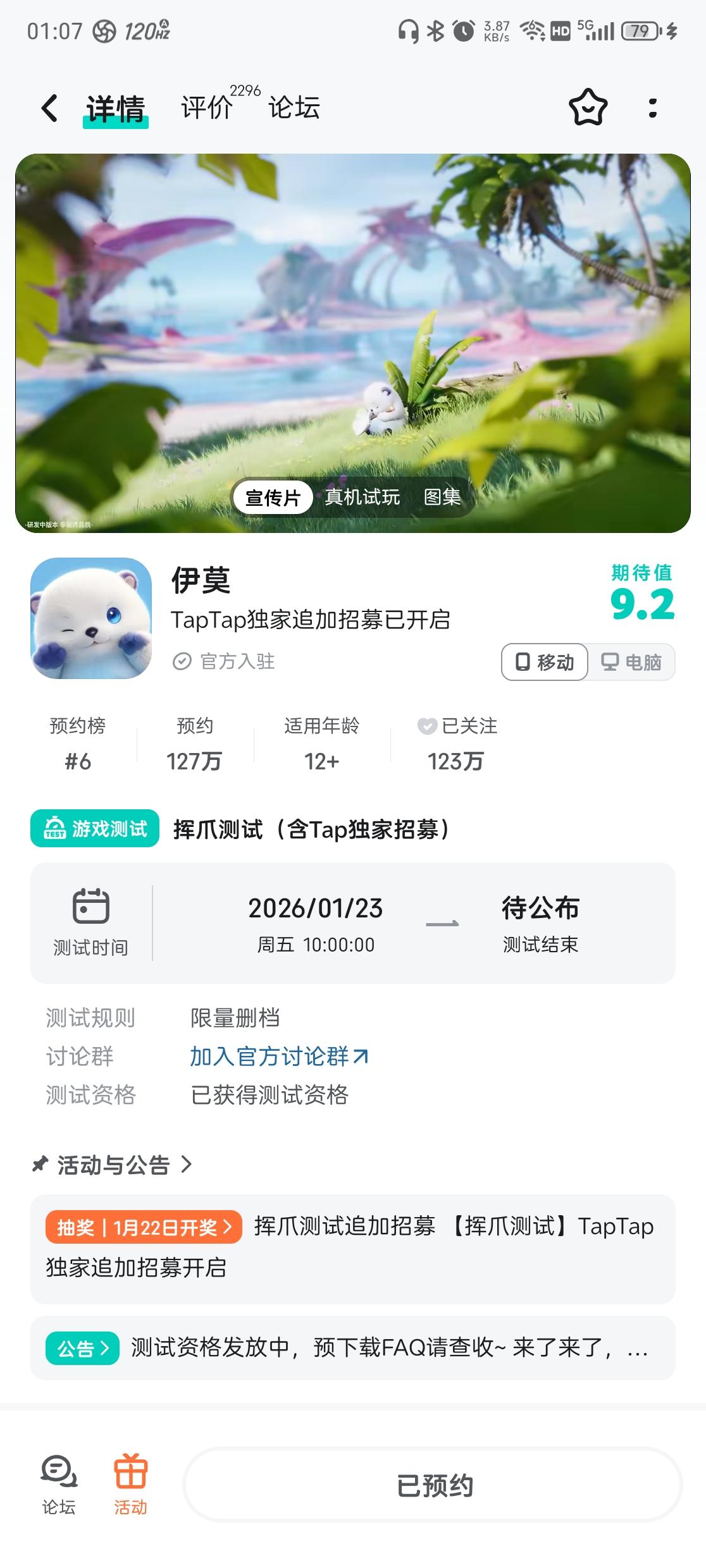 《伊莫》挥爪测试招募即将截止,孩子们已经翘首以盼冒险家的到来啦——⏰ 招募截止时间:2026年1月16日 23:59🎮 测试时间:2026年1月23日正式开启⚠️ 重要提醒:招募截止后,测试资格将陆续发放,我们将以短信&邮件形式进行通知,并同步开启预下载;2026年1月21日起,可登录《伊莫》官网查询资格获得情况。官网预约《伊莫》,公测上线即可获得专属奖励“羞羞獭神秘蛋”~冒险家,我