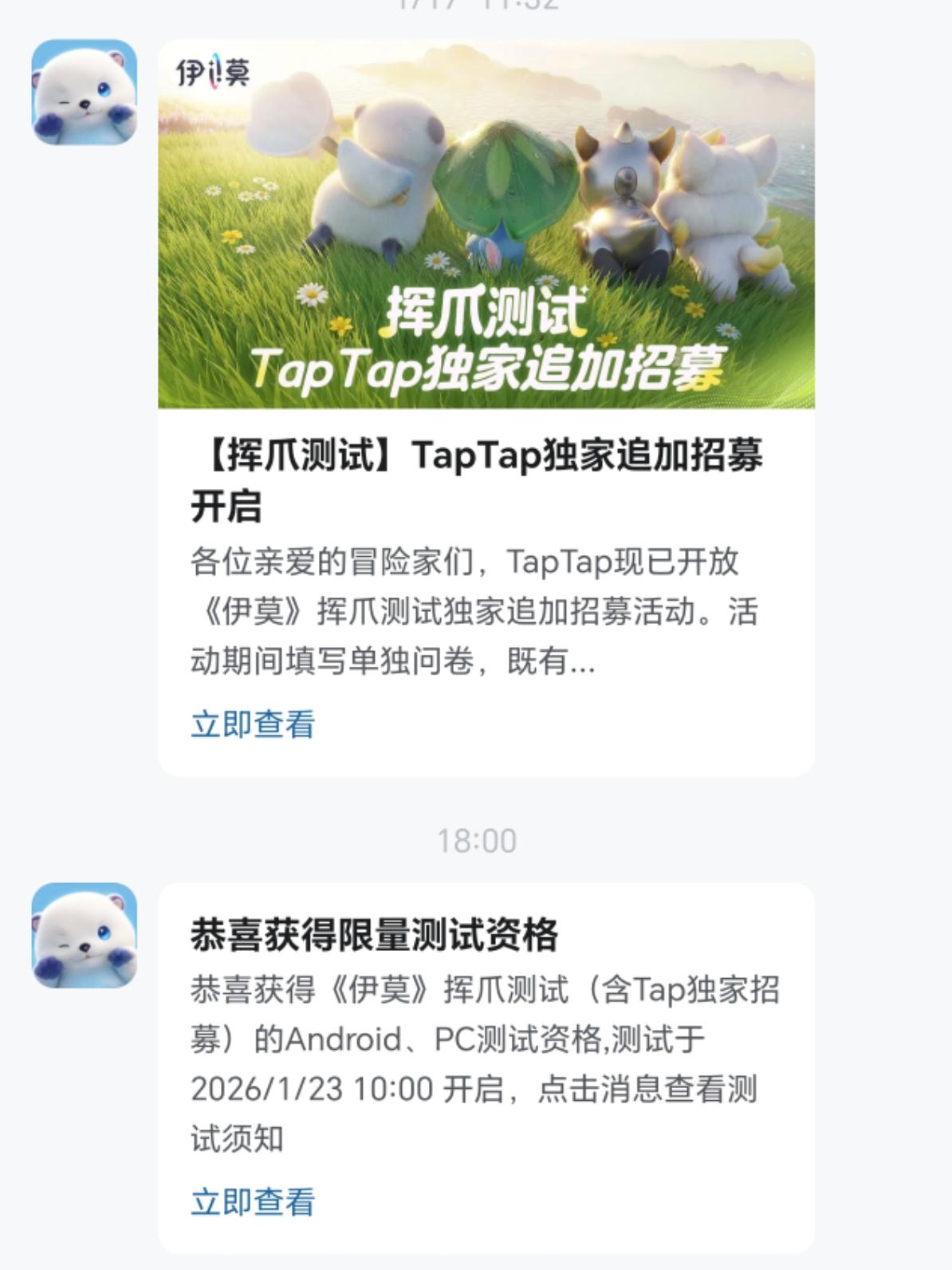 《伊莫》挥爪测试招募即将截止,孩子们已经翘首以盼冒险家的到来啦——⏰ 招募截止时间:2026年1月16日 23:59🎮 测试时间:2026年1月23日正式开启⚠️ 重要提醒:招募截止后,测试资格将陆续发放,我们将以短信&邮件形式进行通知,并同步开启预下载;2026年1月21日起,可登录《伊莫》官网查询资格获得情况。官网预约《伊莫》,公测上线即可获得专属奖励“羞羞獭神秘蛋”~冒险家,我