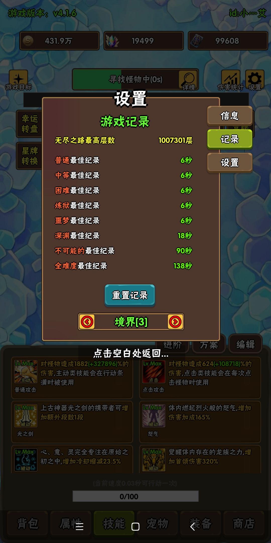 前提:拥有游戏目标转生一千次记录的神器 秘制丹药(减少自动转生时30%的等级丹消耗),通用天赋60级开局拥有金币等级,自动转生打开自动购买金币选项,解锁境2且境2普通常态能打到极限记录,升级增加普通牌子获取的神器 3.3.4版本前理论:转生一轮增加4牌子也就是4*5 20个等级丹 一轮升75级消耗21个等级丹 21-20 消耗1等级丹 靠开遗产弥补并增加这部分等级丹 3.3.4版本理论:与前理论一