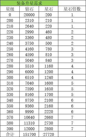 以上为单装备每个阶段升星所需钻石与星石,不计算珍珠。没有下阶段的升星资源不要突破