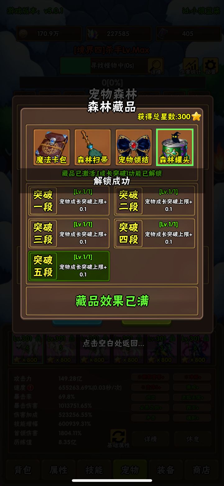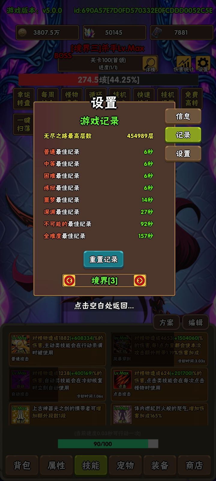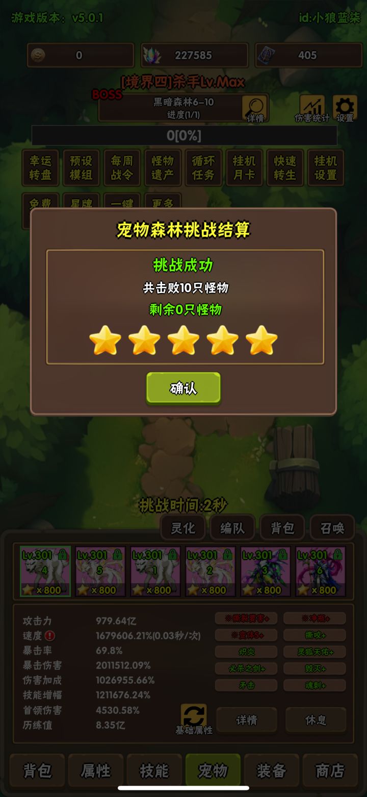 比较极限的配置,昨晚凹了半小时,2次跳99关,1次102秒,1次99秒。我宠物比较差,比我配置还低的只能赌更多毁灭和跳关,或者继续搞5进阶。 配置简单说下: 1、人物基本没啥用,四维够灵能满就行了,开局201级。 2、宠物主力:6s+,4满主力为双瓶变体、机天变体、魂ab、双狐神罚,技能都20~22,比较差;3个历练3.33亿左右,1个2.22亿;双狐也可以换机瓶变体试试。 3、印记:114万左右