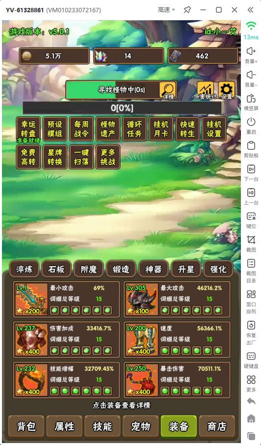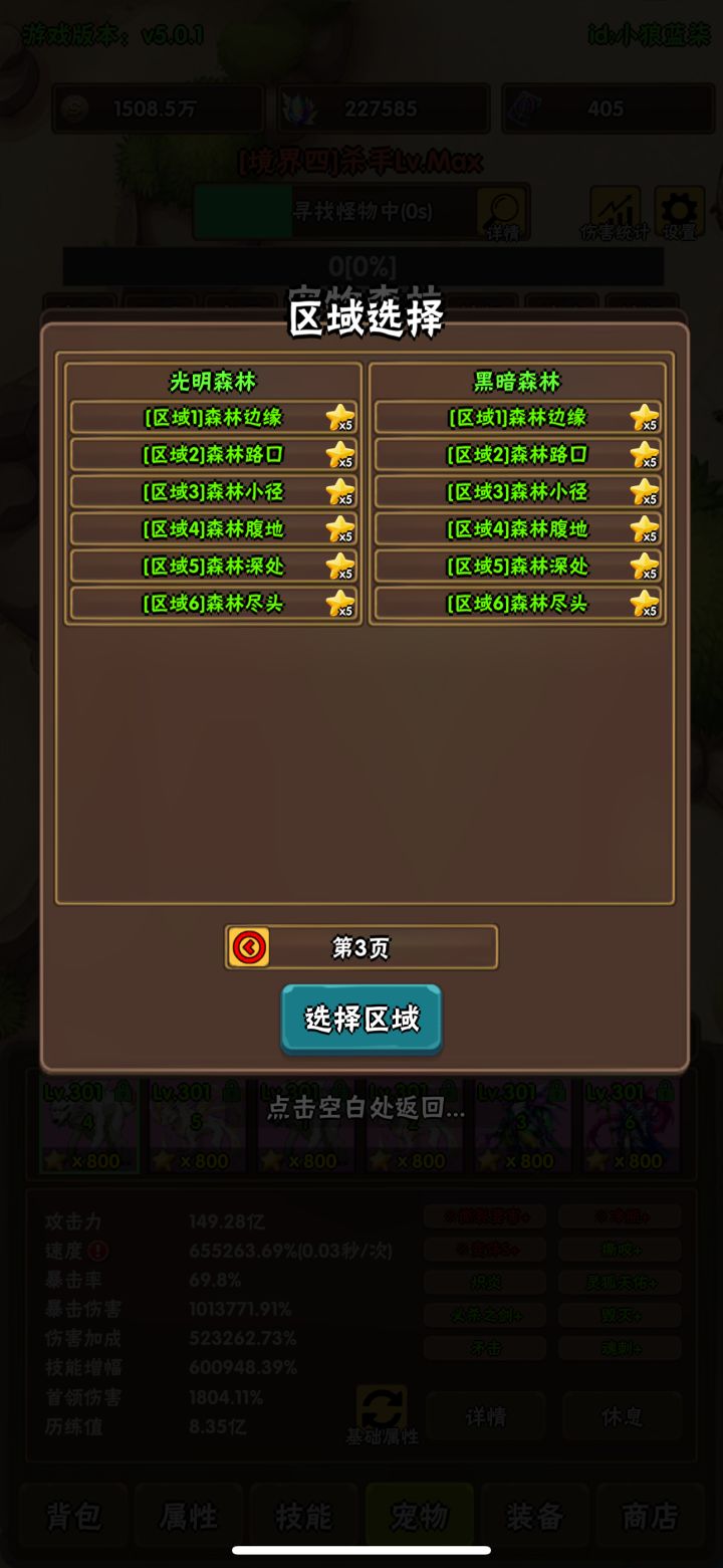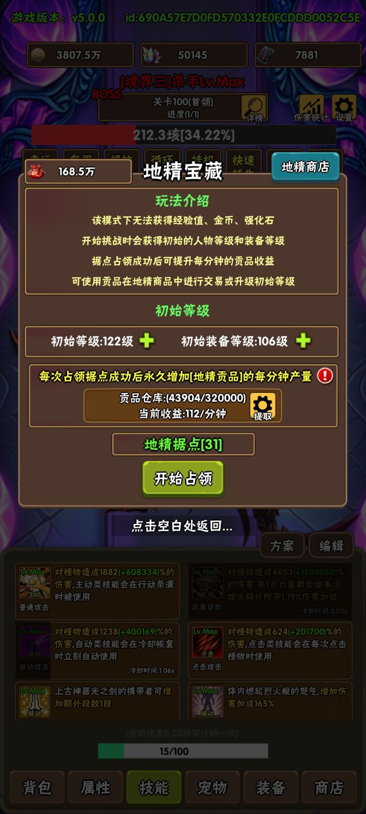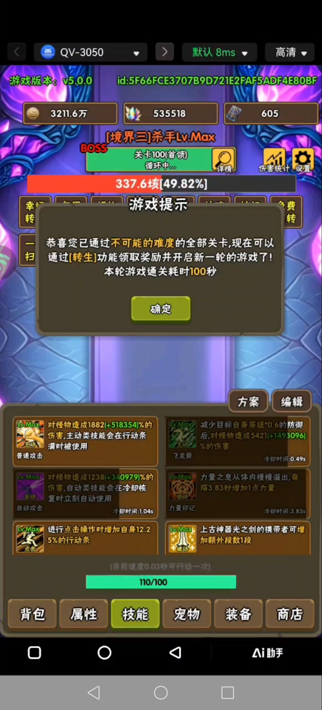 比较极限的配置,昨晚凹了半小时,2次跳99关,1次102秒,1次99秒。我宠物比较差,比我配置还低的只能赌更多毁灭和跳关,或者继续搞5进阶。 配置简单说下: 1、人物基本没啥用,四维够灵能满就行了,开局201级。 2、宠物主力:6s+,4满主力为双瓶变体、机天变体、魂ab、双狐神罚,技能都20~22,比较差;3个历练3.33亿左右,1个2.22亿;双狐也可以换机瓶变体试试。 3、印记:114万左右