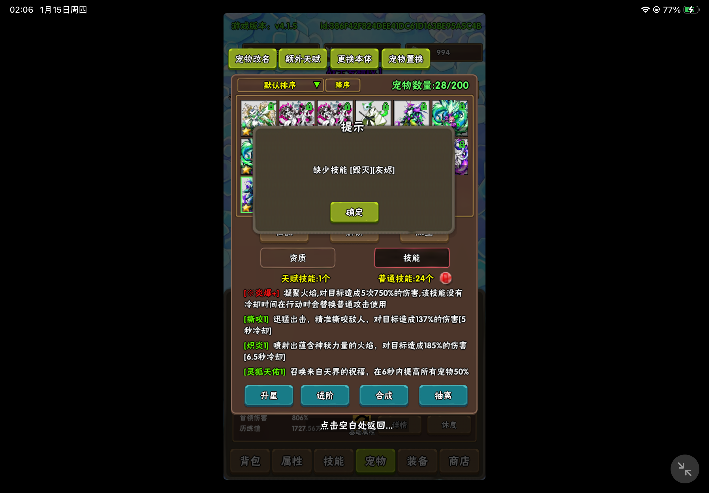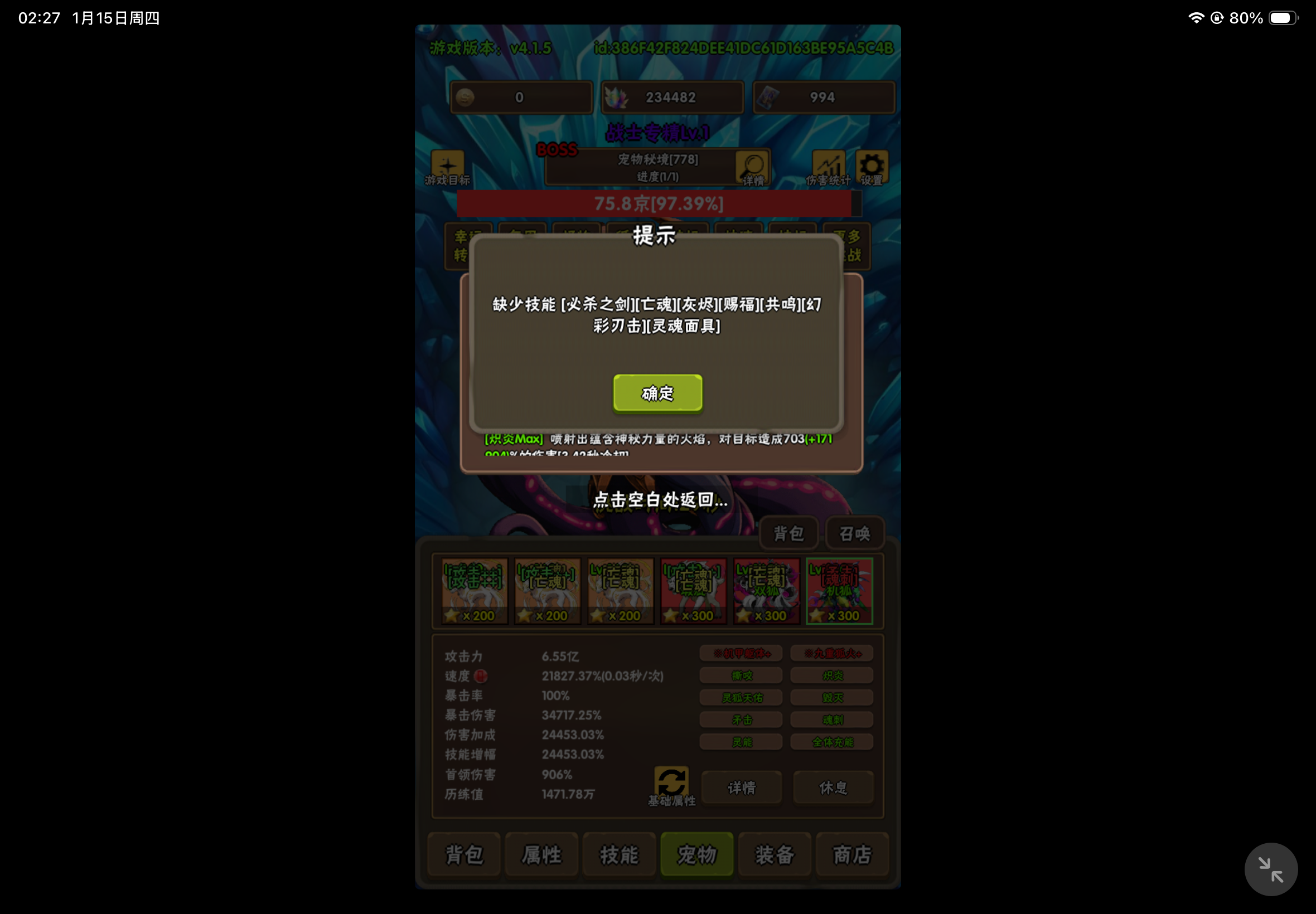 宠物配置,三满+半个狐狸狼,黄瓜满,煤球满机甲狐狸(20技能) 双子天使(20技能 缺领主) 双子狐狸(20技能) 狐狸狼 (20个技能缺审判 + 3000资质+200星)主角配置:四转黑龙,主动技能只保留暴风穿刺,称号战士专精2级,百爆八十穿+最终伤害20%,粉末满,锻造石满三花:洞察,分裂弓,光之弓如果伤害不够就升称号吧,开局吃完潜能果记得猛升头盔,能增加主角不少伤害(大约主角伤