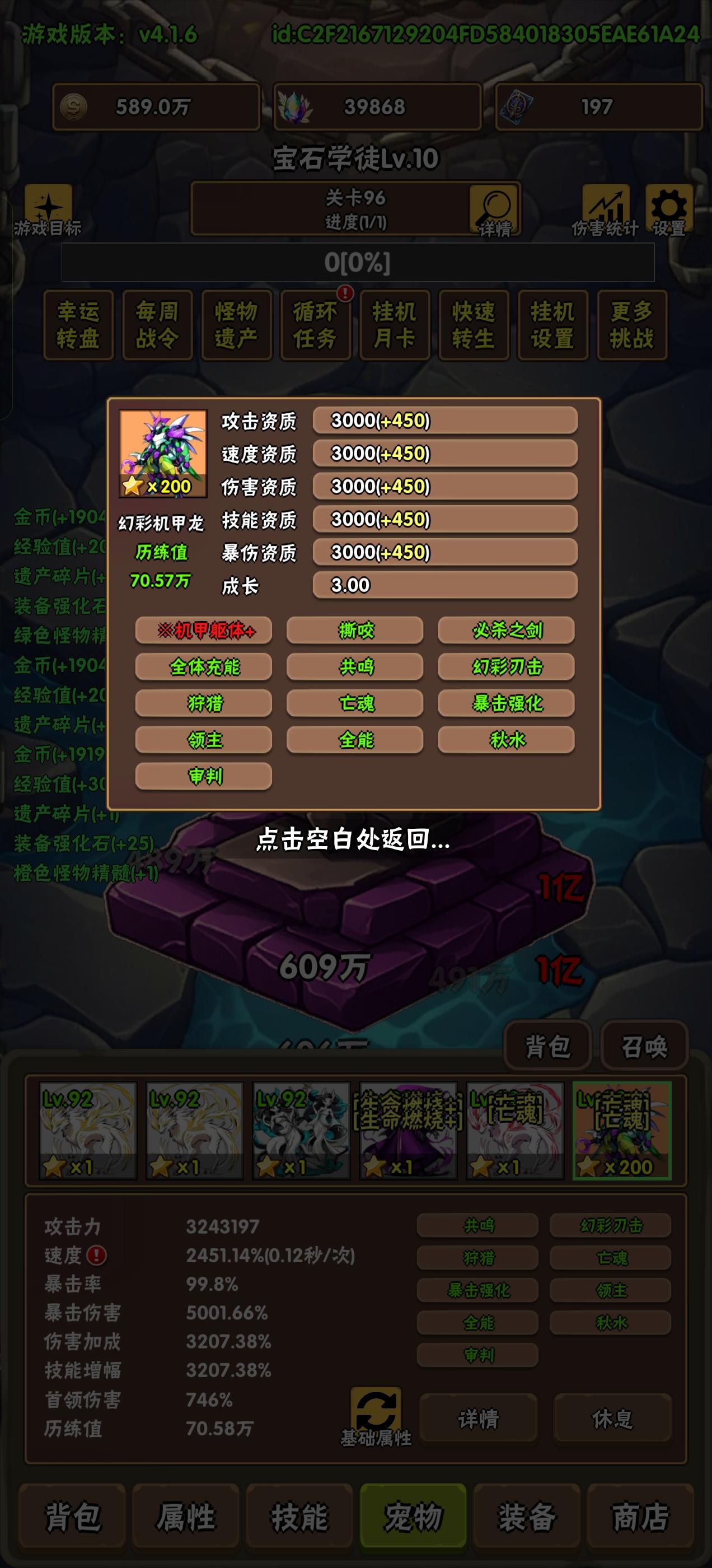 这游戏陆续玩了1个月20天了,刚开始是真的坚持不下去,入门太复杂,全因为抽中了一张月卡,才坚持了下来言归正传,看到论坛和Q群里面很多玩家卡在境界二的不可能100s,好多都动不动是5满、6满还没过的。今天一次性98s过了,感觉自己也算是零氪党不太极限的配置,索性写个帖子分享给大家作为参考。1、人物:四转黑龙,技能全满(技能碎片刷不可能1,月卡党开自动挂机刷即可,250W技能碎片差