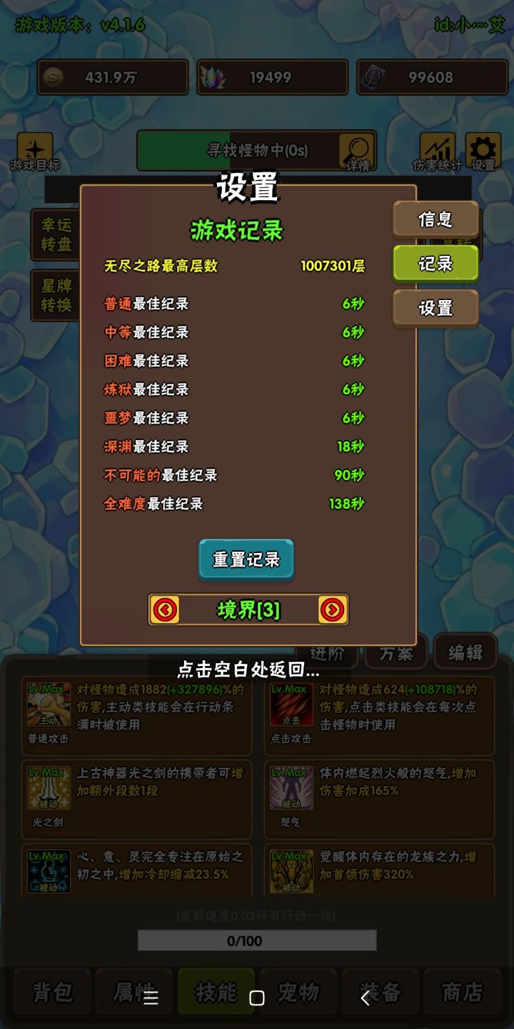 这游戏陆续玩了1个月20天了,刚开始是真的坚持不下去,入门太复杂,全因为抽中了一张月卡,才坚持了下来言归正传,看到论坛和Q群里面很多玩家卡在境界二的不可能100s,好多都动不动是5满、6满还没过的。今天一次性98s过了,感觉自己也算是零氪党不太极限的配置,索性写个帖子分享给大家作为参考。1、人物:四转黑龙,技能全满(技能碎片刷不可能1,月卡党开自动挂机刷即可,250W技能碎片差