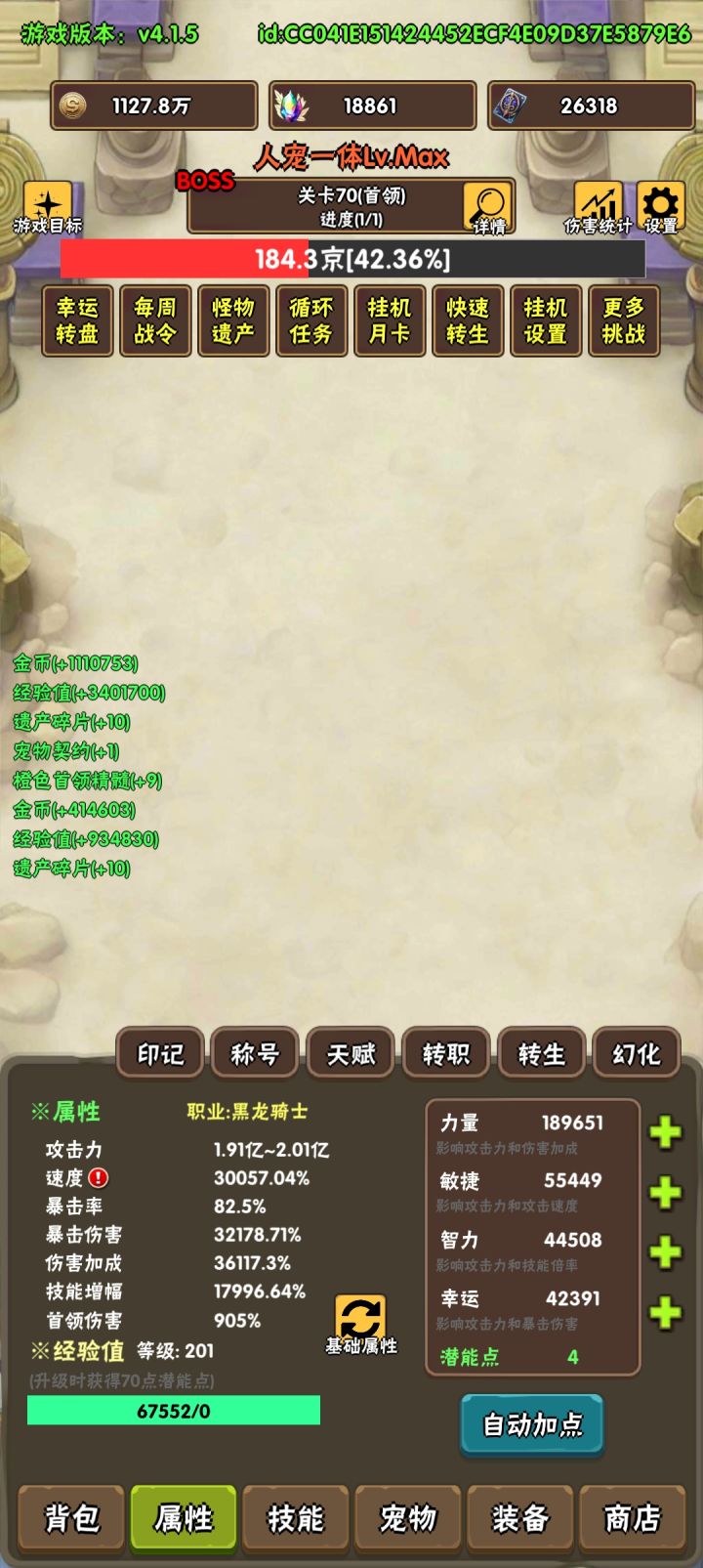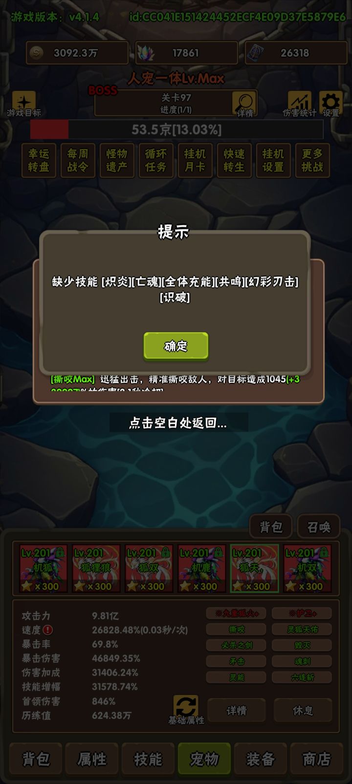 宠物配置,三满+半个狐狸狼,黄瓜满,煤球满机甲狐狸(20技能) 双子天使(20技能 缺领主) 双子狐狸(20技能) 狐狸狼 (20个技能缺审判 + 3000资质+200星)主角配置:四转黑龙,主动技能只保留暴风穿刺,称号战士专精2级,百爆八十穿+最终伤害20%,粉末满,锻造石满三花:洞察,分裂弓,光之弓如果伤害不够就升称号吧,开局吃完潜能果记得猛升头盔,能增加主角不少伤害(大约主角伤