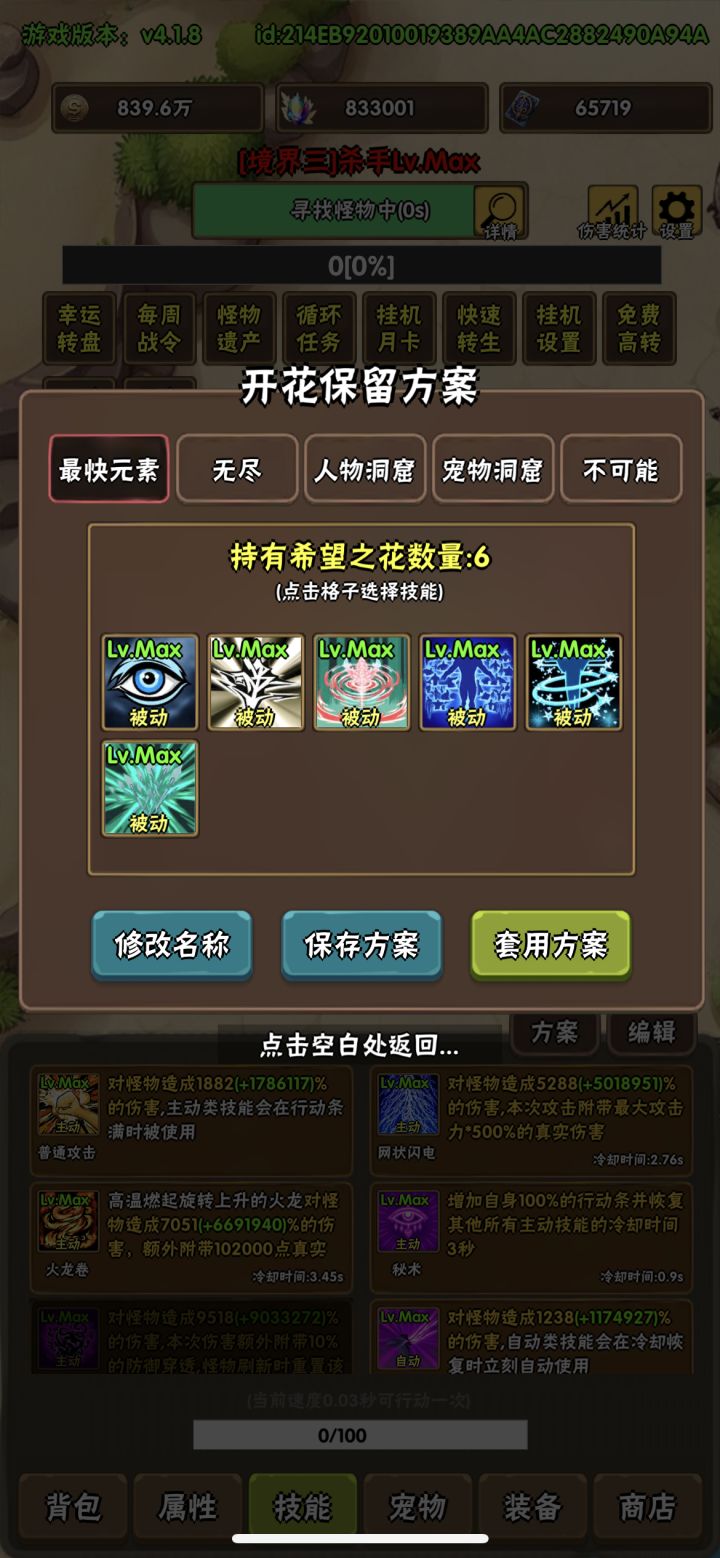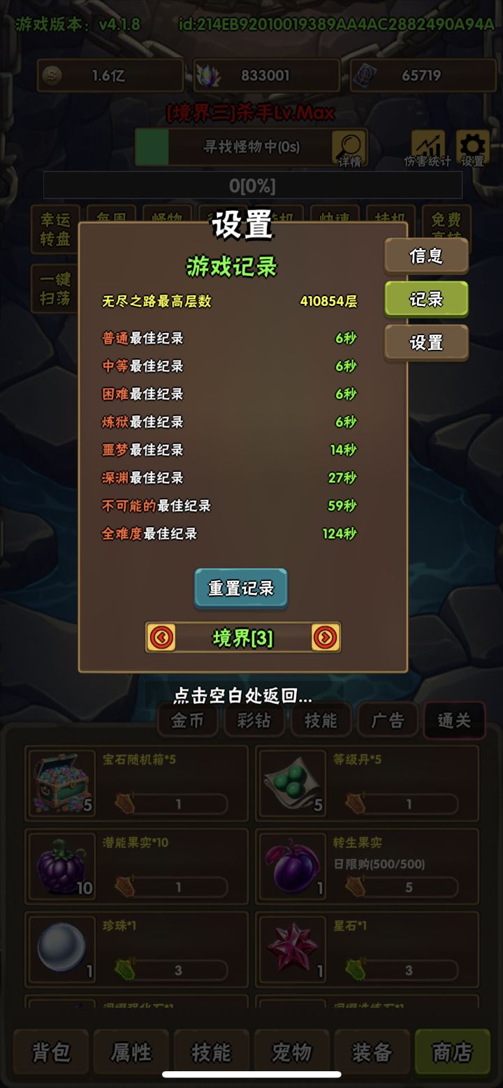 比较极限的配置,昨晚凹了半小时,2次跳99关,1次102秒,1次99秒。我宠物比较差,比我配置还低的只能赌更多毁灭和跳关,或者继续搞5进阶。 配置简单说下: 1、人物基本没啥用,四维够灵能满就行了,开局201级。 2、宠物主力:6s+,4满主力为双瓶变体、机天变体、魂ab、双狐神罚,技能都20~22,比较差;3个历练3.33亿左右,1个2.22亿;双狐也可以换机瓶变体试试。 3、印记:114万左右