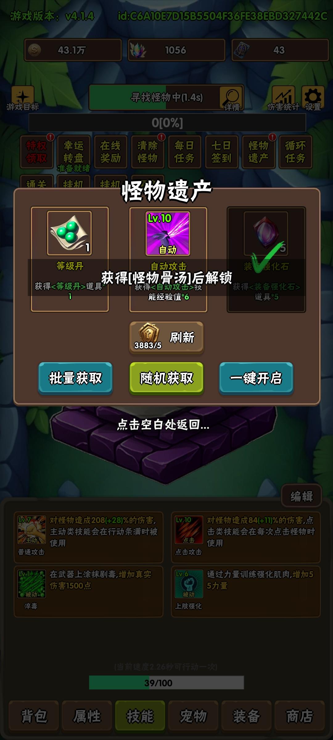 宠物配置,三满+半个狐狸狼,黄瓜满,煤球满机甲狐狸(20技能) 双子天使(20技能 缺领主) 双子狐狸(20技能) 狐狸狼 (20个技能缺审判 + 3000资质+200星)主角配置:四转黑龙,主动技能只保留暴风穿刺,称号战士专精2级,百爆八十穿+最终伤害20%,粉末满,锻造石满三花:洞察,分裂弓,光之弓如果伤害不够就升称号吧,开局吃完潜能果记得猛升头盔,能增加主角不少伤害(大约主角伤