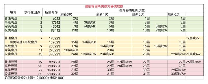 最后附一张速刷轮回对应的修为秘境层数。
