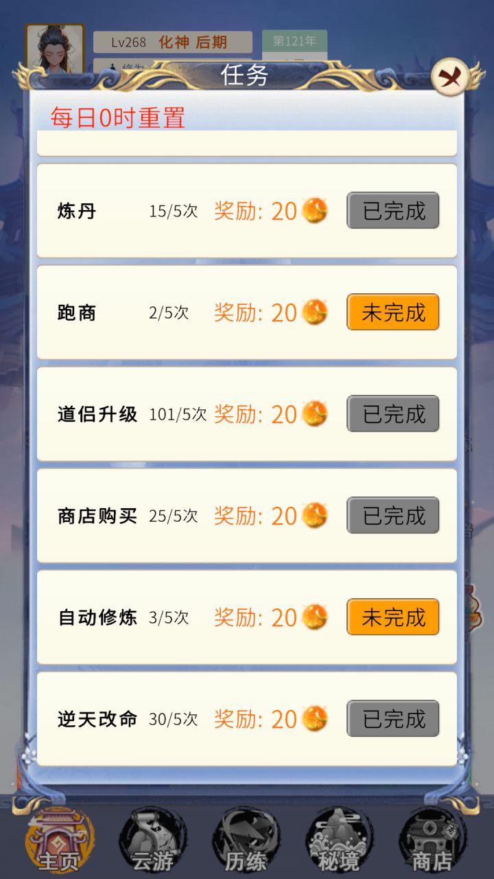 整体重新安装了3次,不到两百广告,最后一次到底还是卡在功法上了无法解锁下一个,不过无所谓了反正成就无法触发,大家注意下跑商背包和元宝看广告每局都更新就是说十几个广看下来就管一局,最好是到整数万元宝的时候再选结束跑商,增加每秒灵石还是有用的。