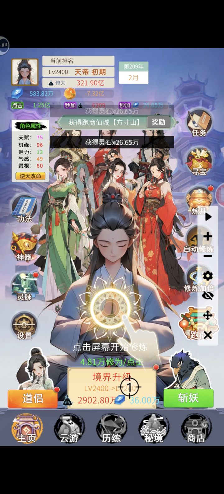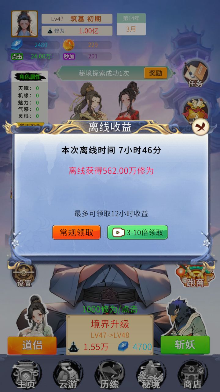 升级是真的慢 越往后越慢,前期12小时离线随随便便就能点五六十级后期运气不好只能点十三四级左右,前期跑商多加点灵石还是很有必要的 手机更改时间蹭离线时长奖励后还要在游戏里挂一两分钟 要不然数据不会保存 ;日期往后调太久了广告会加载不出来 需要调回当前时间进入游戏后退出 再重新往后设置时间