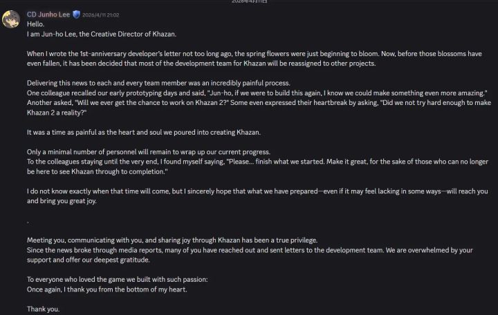 2026 年 4 月 8 日,韩联社援引 Nexon 官方声明报道,负责 DNF 首款 3A 单机《第一狂战士:卡赞》(The First Berserker: Khazan)开发的 Neople 团队已遭全面重组,约 100 名核心成员被转入公司内部 "R 团队" 重新分配部门,标志着该项目开发团队实质上已解散。这一决定距游戏发售仅约 1 年时间,引发游戏行业对 IP 衍生单机开发模式的广泛讨论