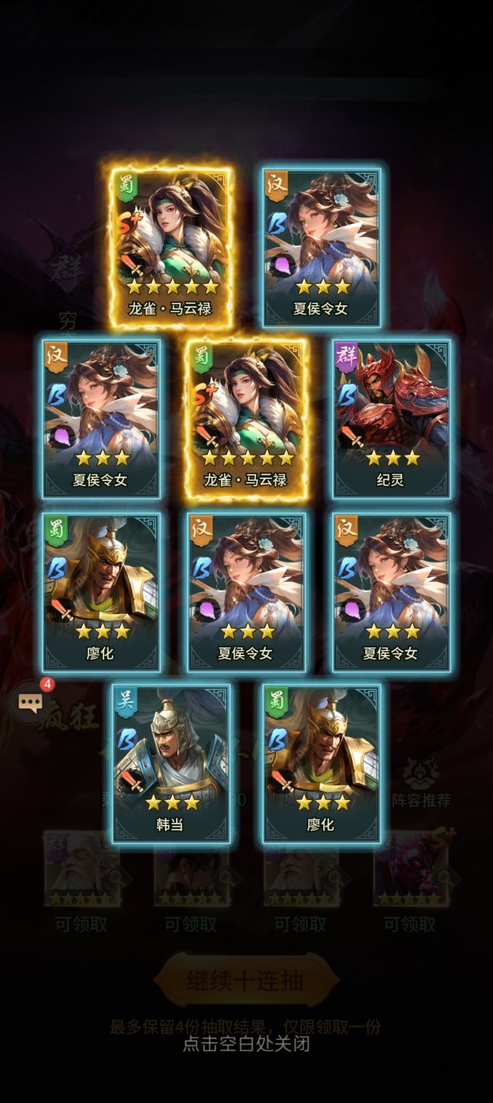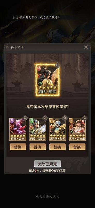 千抽自选,最好选推荐的强力武将,没抽到九尾狐貂蝉,勉强用穷奇吕布吧,群伤推图挺强的
