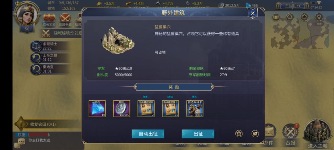 一、野外建筑介绍 上一篇我们为大家详细介绍了英雄之城3的各类宝藏玩法,除了宝藏之外,地图上可以随机遇到一些特殊的建筑,给资源或者给予银币、钻石和道具奖励,奖励内容不输于黄金宝藏,当然我们也需要了解清楚占领规则,这些野外建筑分为五类: (一)守卫类 ①在地图上的奇迹点、名城或者城镇周围出现; ②在测试中观察研究,奇迹点出现的守卫守军难度最高,奖励最好; ③守卫队伍每周日早晨7点刷新,每个城主