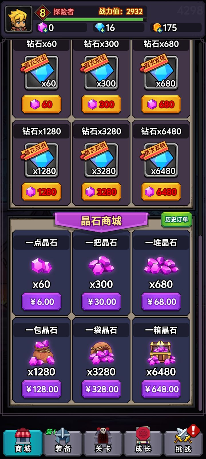 1.游戏比较单一,说是暗黑belike,实际上刷图有体力限制。60钻15体我记得是。就是6块钱买15体力,刷图6体一次,6块买2.5次刷图机会