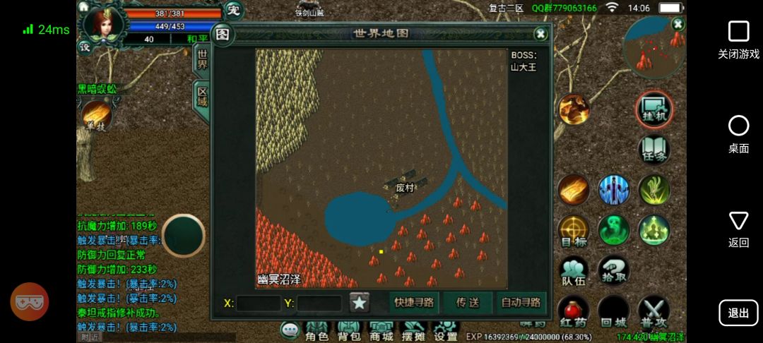 直接进去正题, 这游戏复古区没有任务,领完新手礼包,进游戏(双击吃双,双击穿装备)直接新手村点挂机不用管它,一小时后上线卖了兔肉,跟鹿皮,在杂货店更新下装备(点开右上角圆圈地图,在下面找到快捷寻路,找个杂货店,其他npc同里,这里的船夫就是传送者) 两三小时后应该有十级左右了,再回去卖卖东西,武器卖武器商人,肉类卖屠夫,有钱了再去武器商人更新一套装备就去蚂蚁洞!(蚂蚁洞点开圆圈地图,点你想去的地